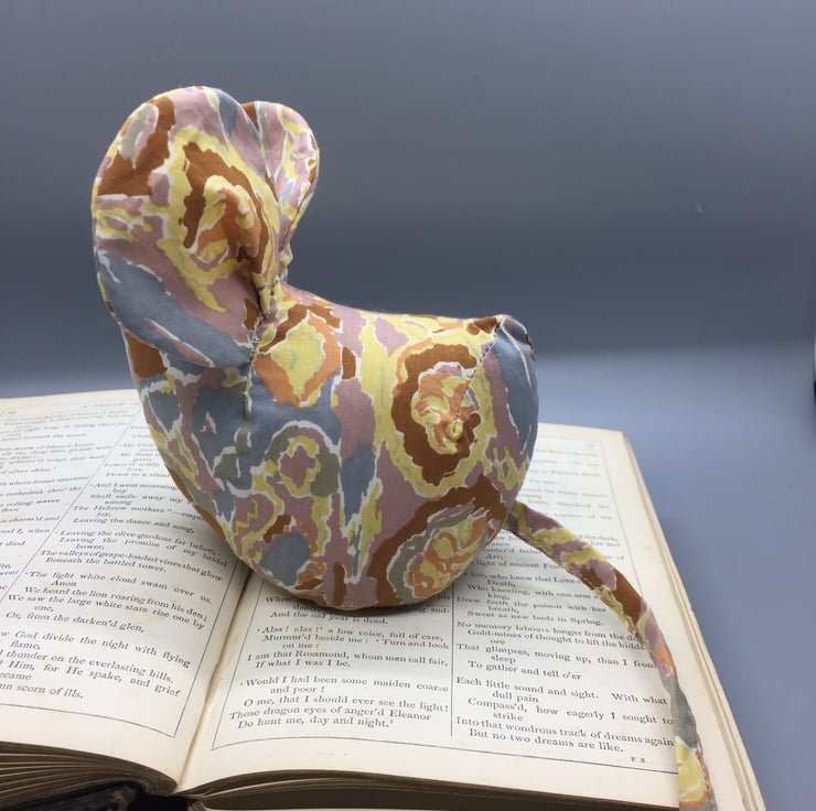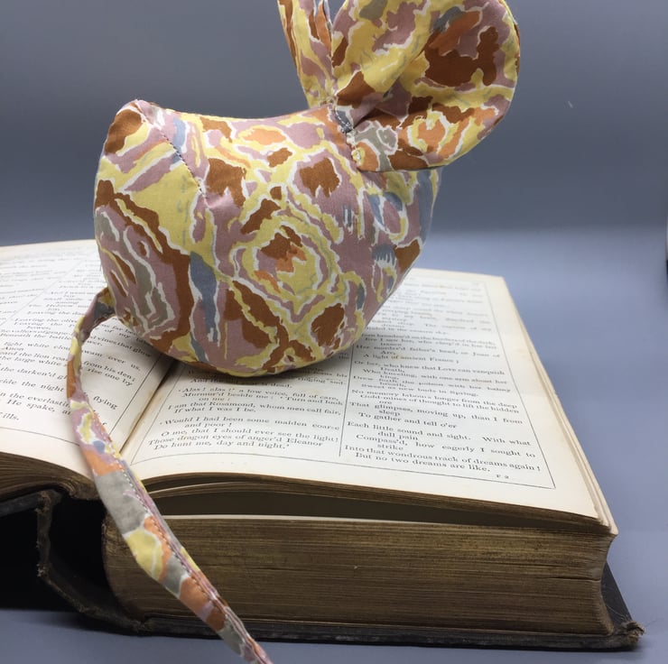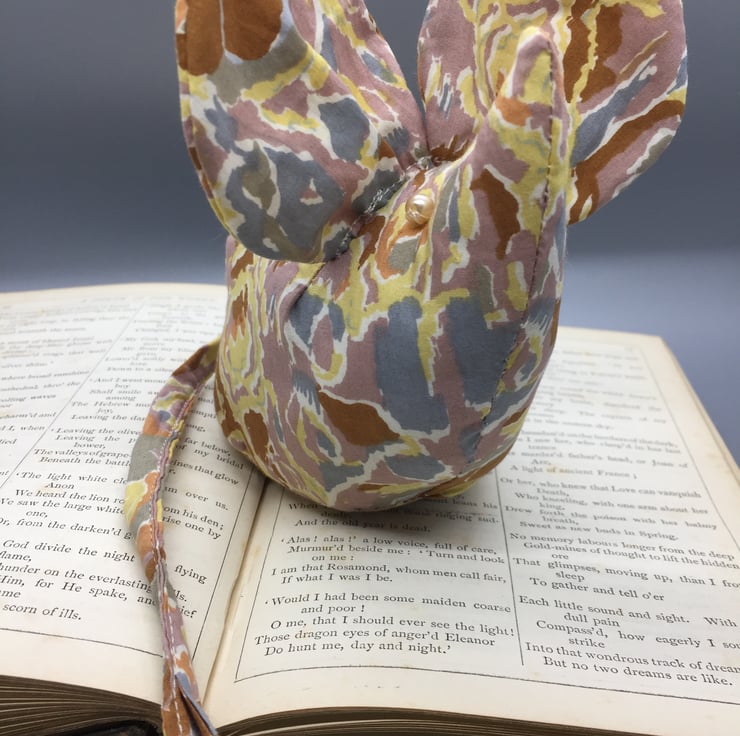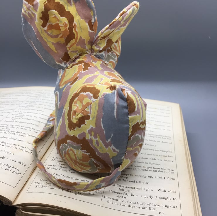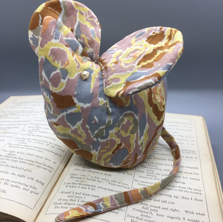 This mouse is made of a multicoloured fabric of grey, yellow and pale orange mix. Eyes are pearl beads.