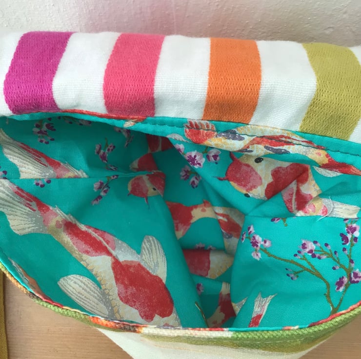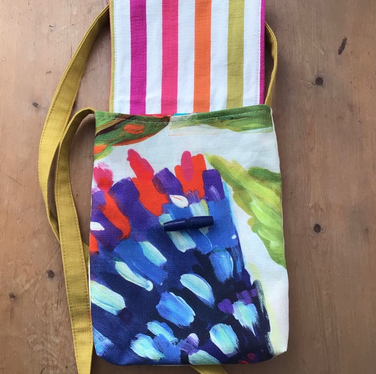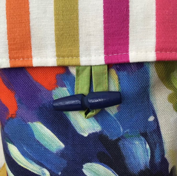 This bag has a multi coloured striped flap with a toggle and loop fastening.
