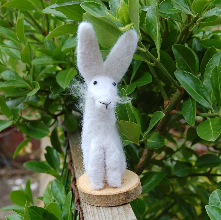 The white hare measures 4 ins tall and is attached to a wood slice.