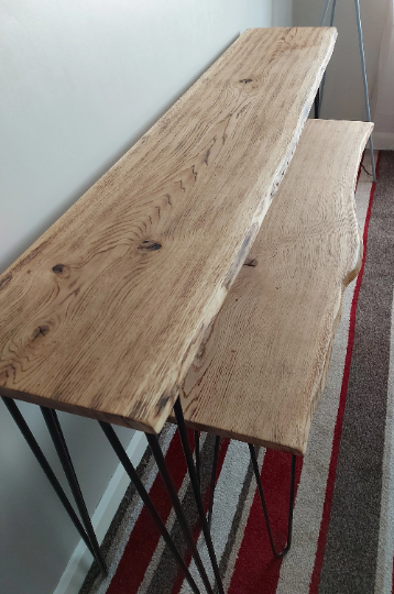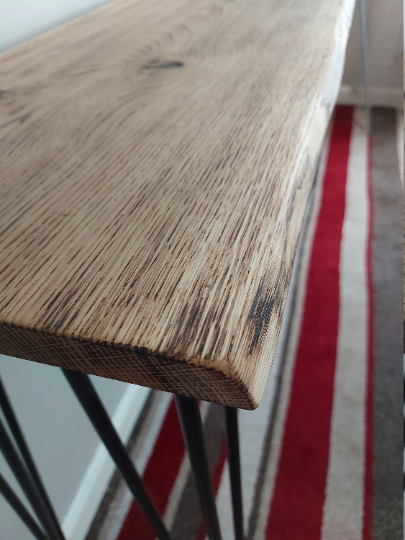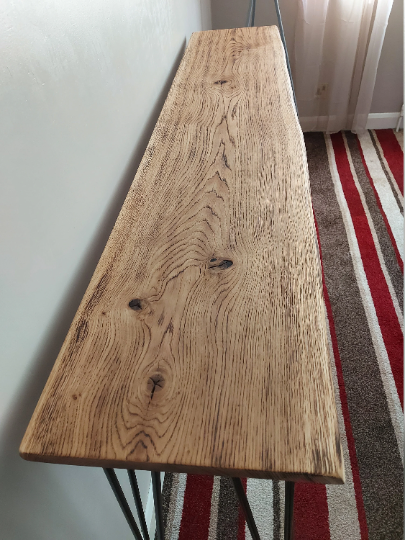 Beautiful breakfast bar table hand made using solid oak, lightly charred to bring out the natural grain within the wood.