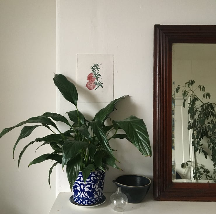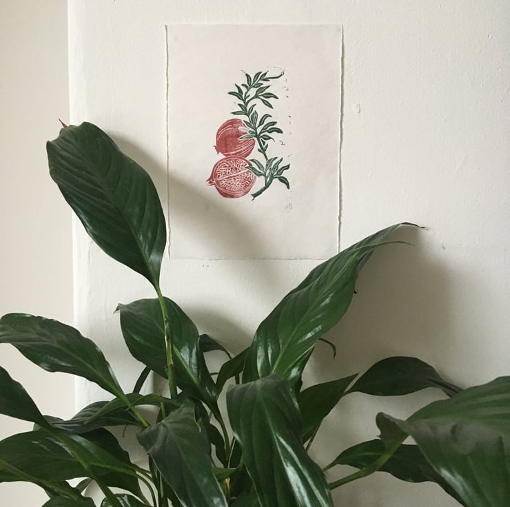 A linocut of pomegranates in a botanical illustration style, printed onto handmade paper.