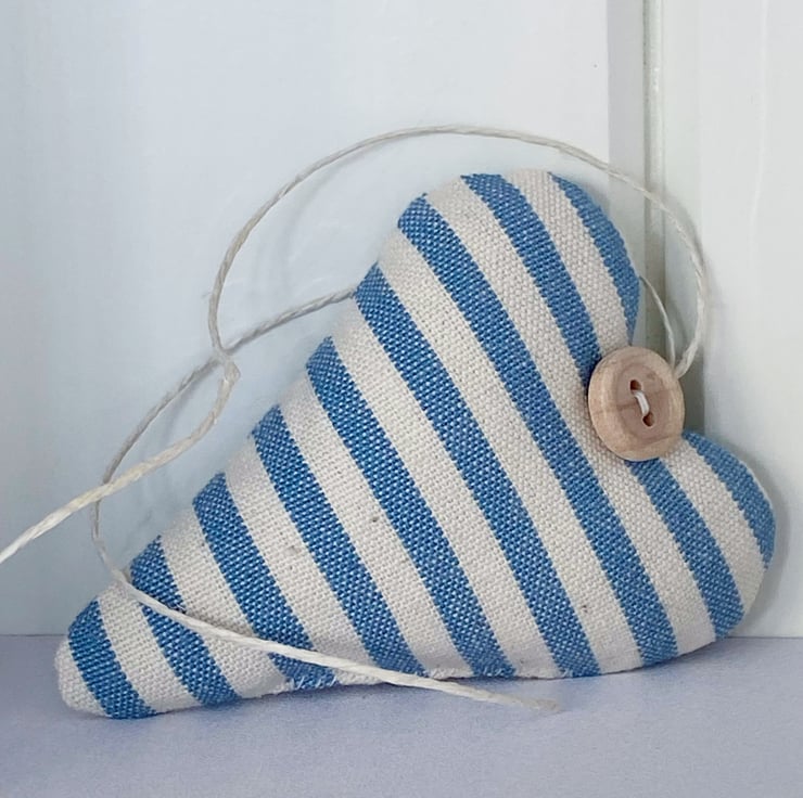 A very pretty cornflower blue striped heart decoration, fragrant with Hampshire lavender ... The fabric is a superior quality woven cotton with a lovely weighty feel. Each heart is hand finished with a little round wooden button and with natural hemp twine hanging ties.