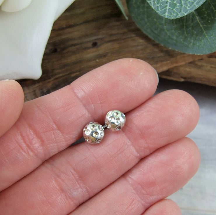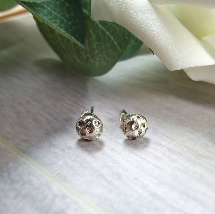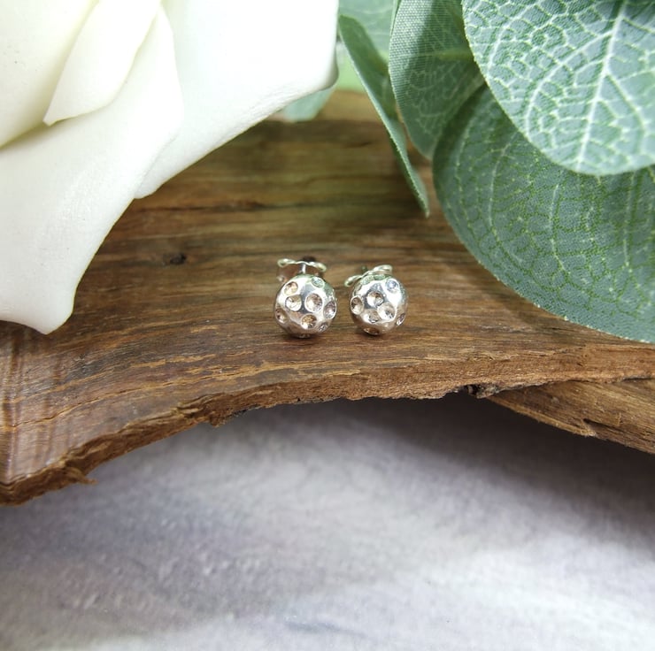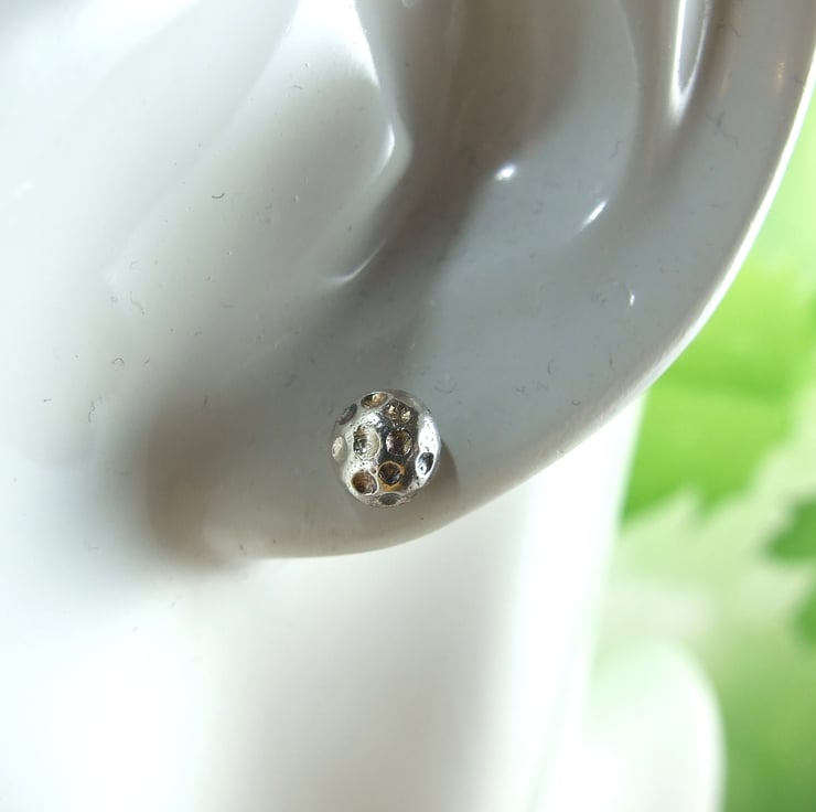 The small studs have been created from recycled sterling silver heated to melting point creating little silver nuggets which I have then carved into to crate a wonderful craterred surface. Soldered to regular .925 sterling silver ear posts with butterfly backs and burnished to a shine.