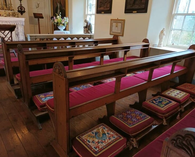 The complete Traquair House Chapel Needlework Collection is on view in the chapel and was embroidered by community stitchers to celebrate the 900th anniversary of Traquair House.