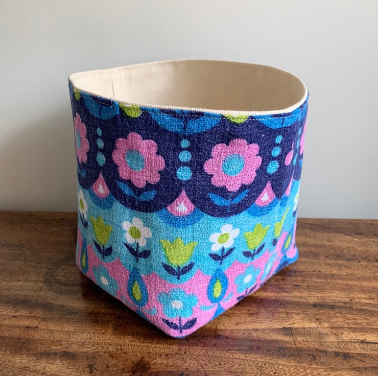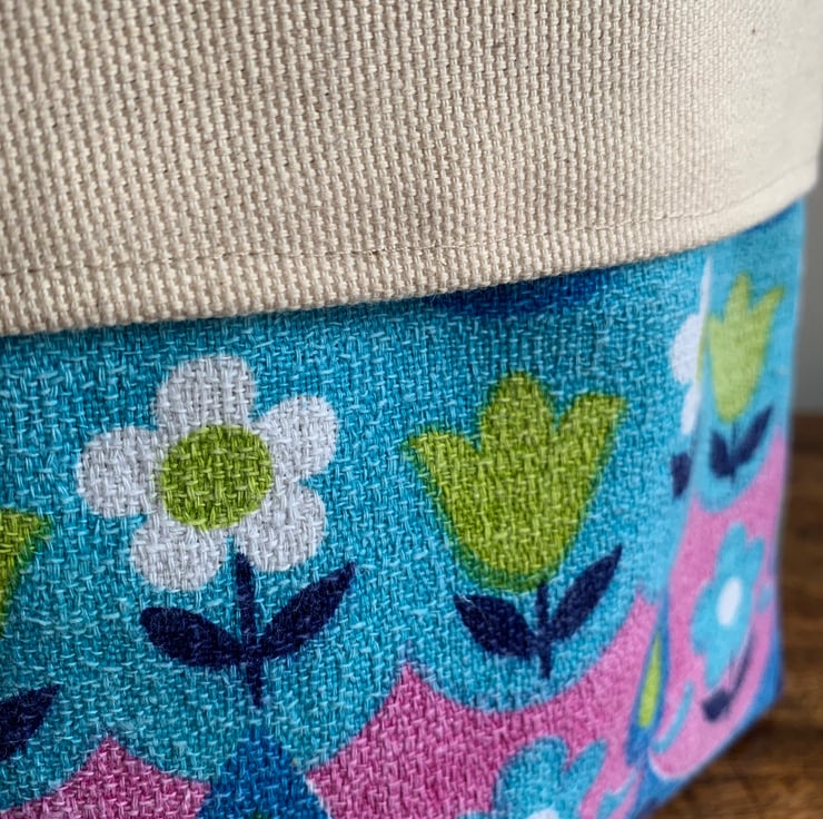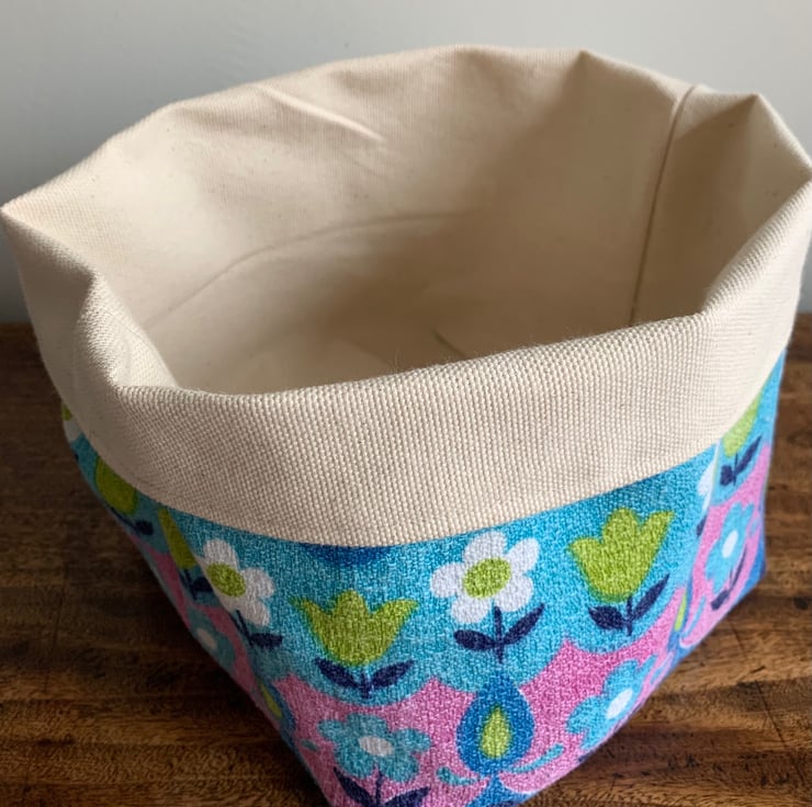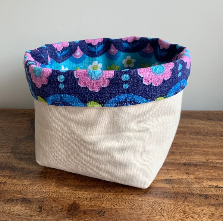 Reversible fabric storage basket made from colourful vintage barkcloth and sturdy cream cotton canvas. Can be used with a turn-down to make the most of the contrasting fabrics.