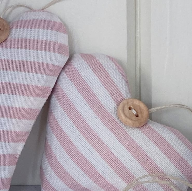 Soft, gentle and delicate pink stripes… In a superior quality woven cotton fabric and filled with super fragrant locally grown Hampshire lavender or with toy grade stuffing, and hand finished with a round wooden button and natural hemp twine hanging ties.