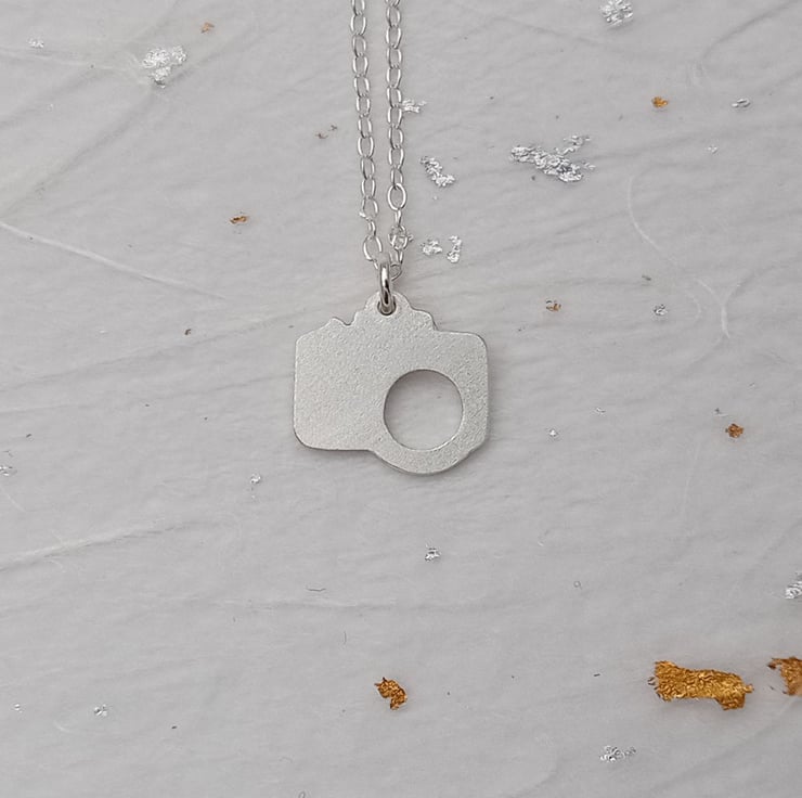 I have created this necklace by cutting the camera shape from recycled sterling silver by hand, after filing and finishing it was attached to a sterling silver chain. It is part of a collection of sterling silver jewellery based on different hobbies, which includes matching earrings.