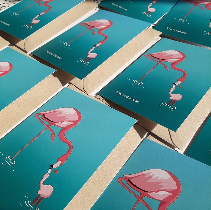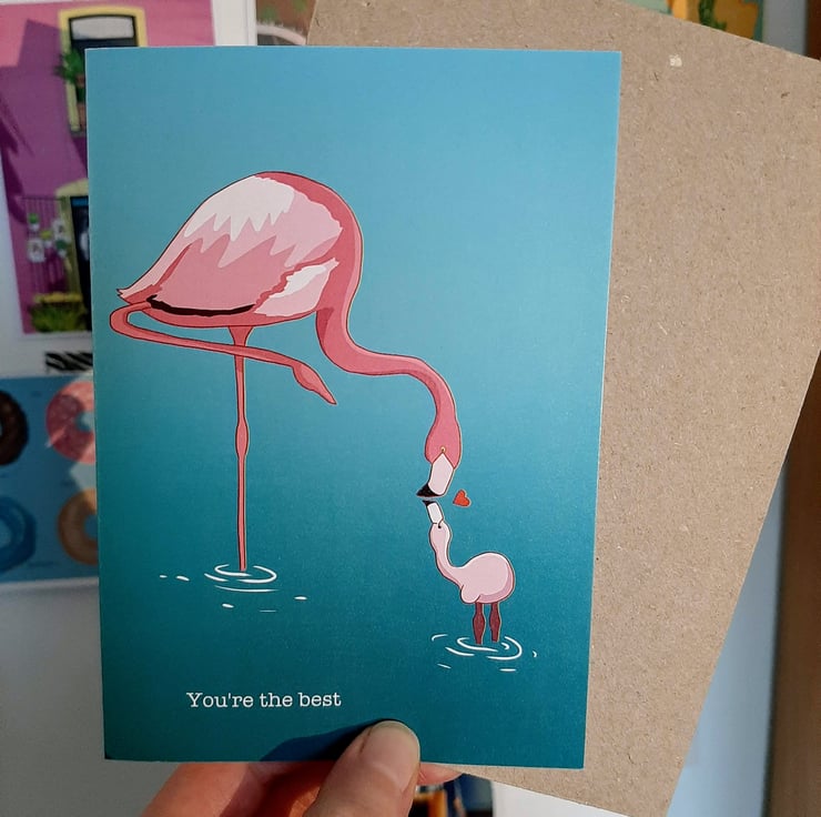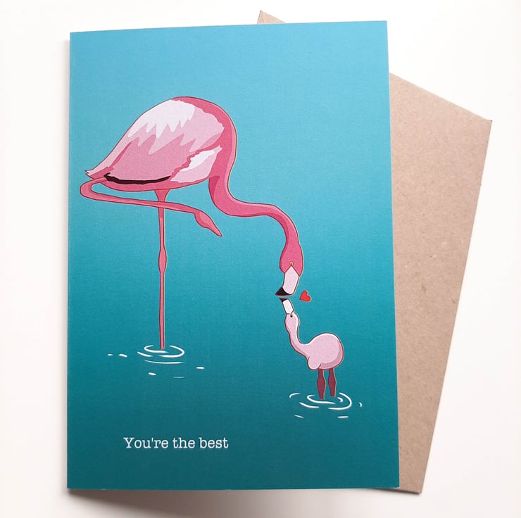 A bright blue background and pink flamingos, featuring a small red heart, with 'You're the best' typed on the front in white.