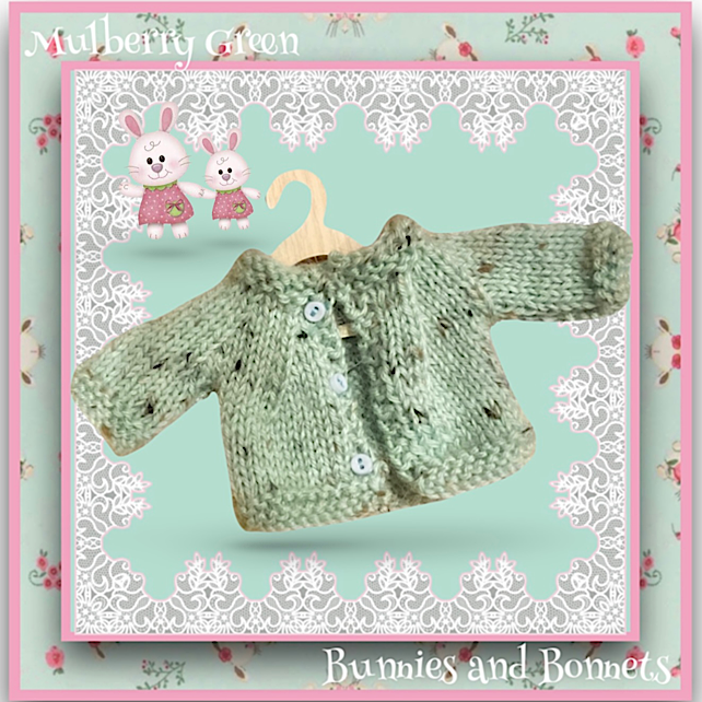 A sweet little pale turquoise flecked cardigan to fit the Mulberry Green characters. The cardigan has a three little turquoise buttons and looks lovely with the other things in the ‘Bunnies and Bonnets’ collection in my shop.