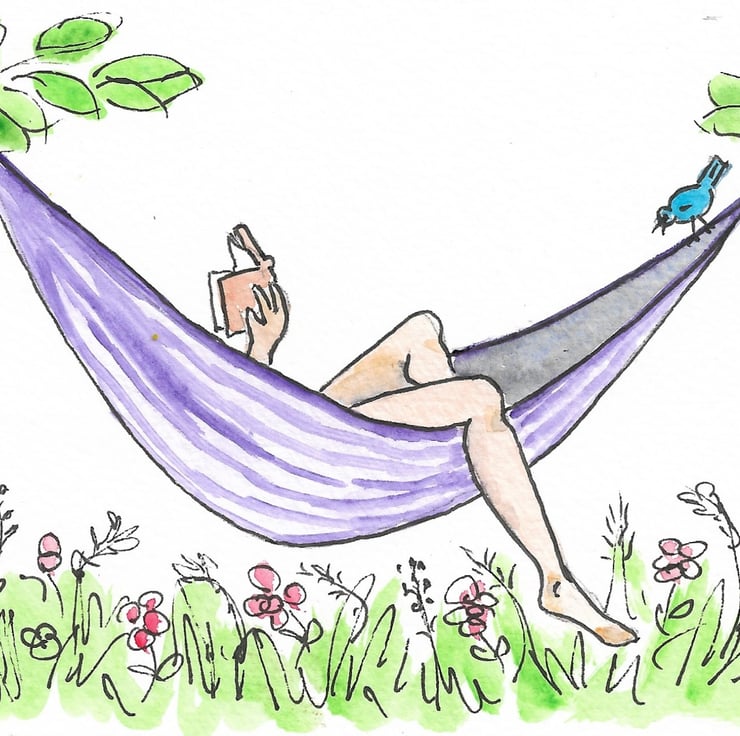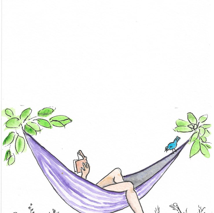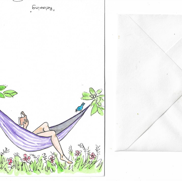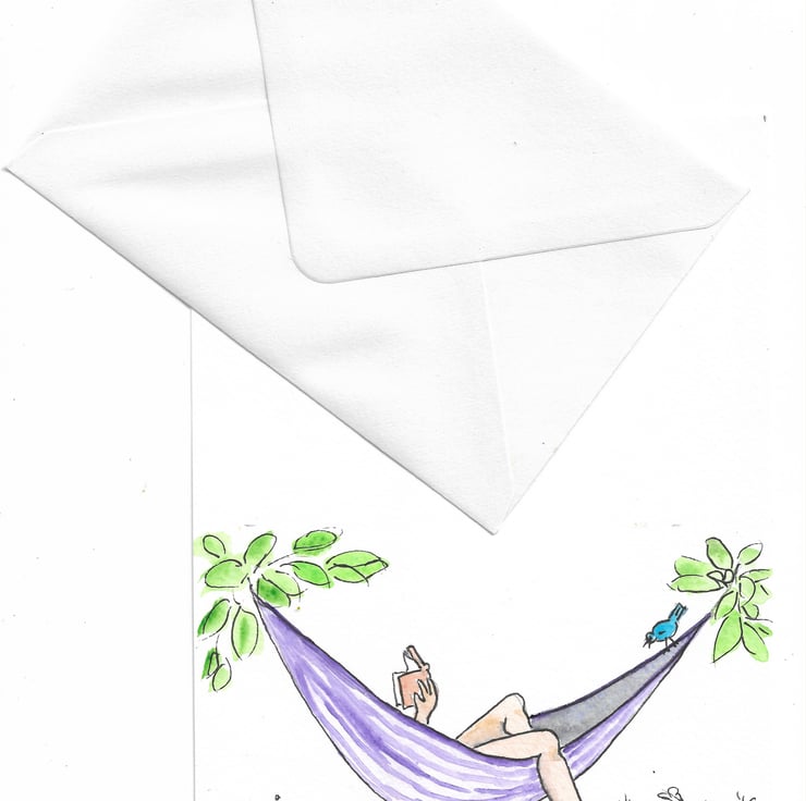 A printed card of my own original painting of a woman in a hammock relaxing in the garden.
