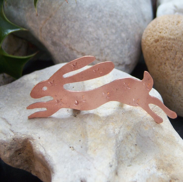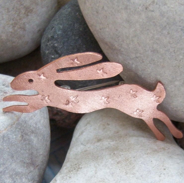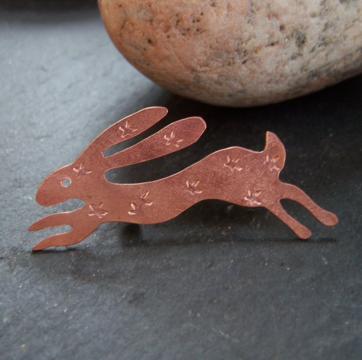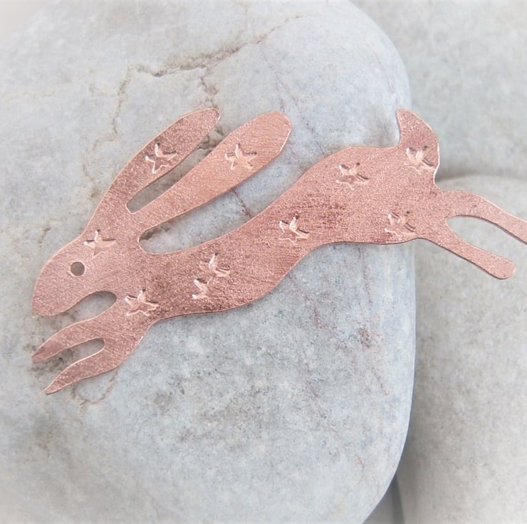 A leaping hare cut from copper sheet and imprinted with random stars. It has a frosted finish. Approximately 5.5cms long from the end of the nose to the tip of the toes. Sterling silver brooch fastener.