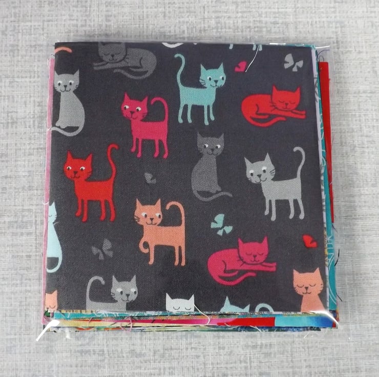 A charm pack made up of 30 small pieces of cotton fabric.