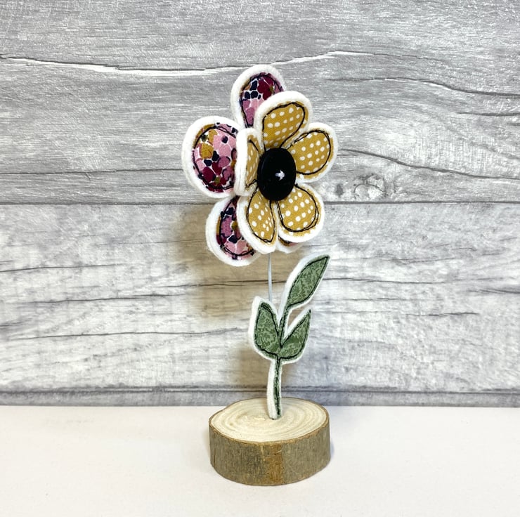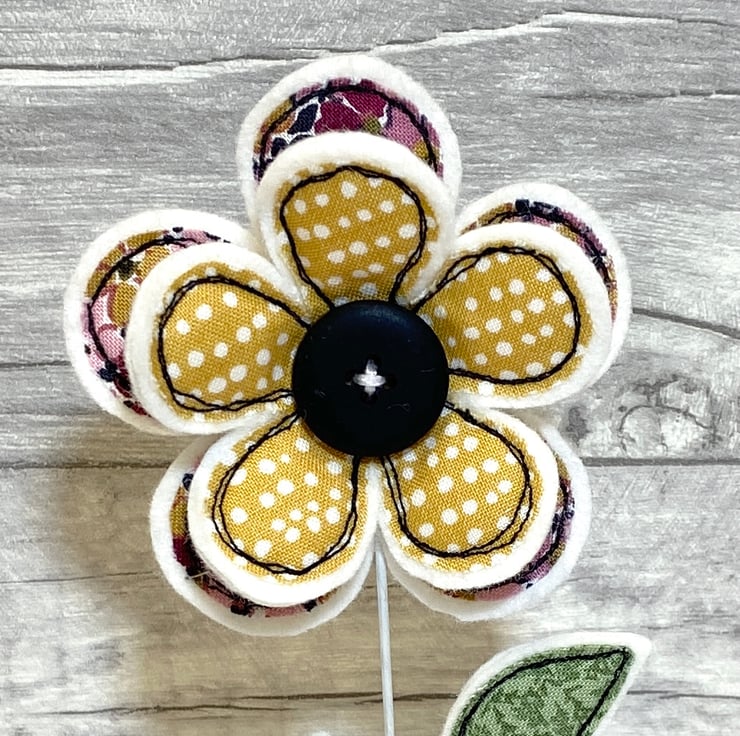A double layered flower hand cut from fabric and adorned with a button. It is attached to a wire stem where a fabric leaf is adhered and secured into a wooden base. The flower and leaf are machine embroidered onto a felt background, this is done using my own hands not computer based.