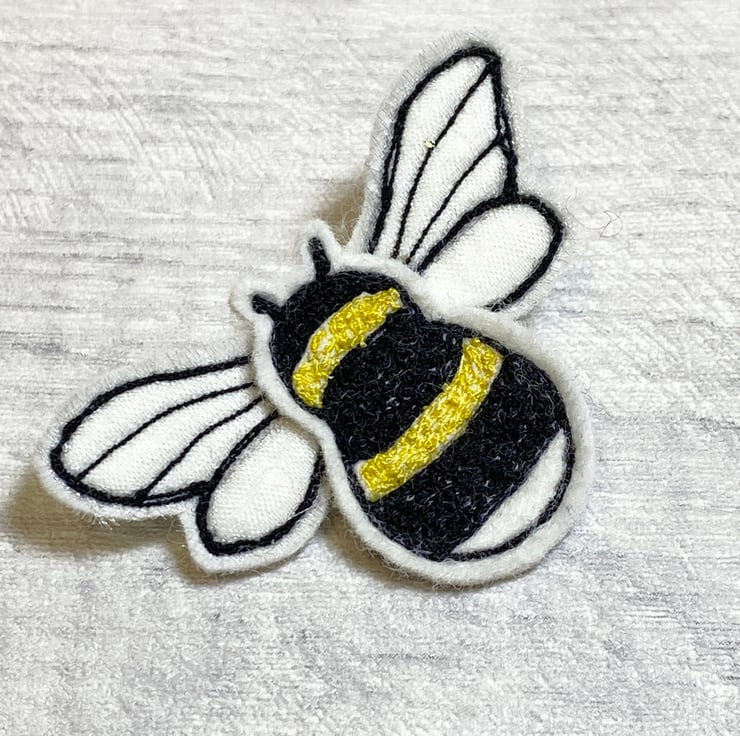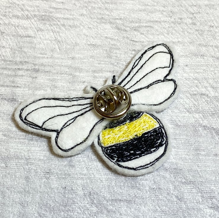 A textile brooch of a stylised bumble bee. Machine embroidered using my own hands and not a computer. The body of the bee is from thread and felt and the wings have a voile covering the felt giving a slight iridescence to them. The back has a pin fastening.
