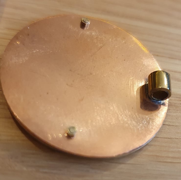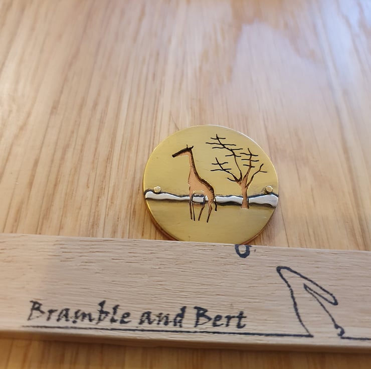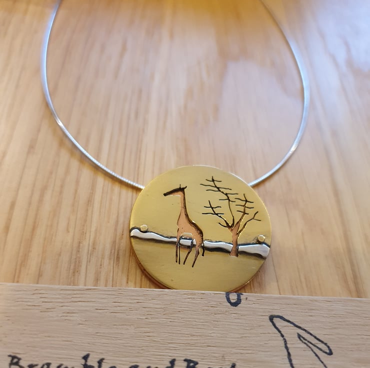 Copper and brass round pendant made in a small Sheffield studio. The giraffe and the tree have been hand pierced from a piece of brass. A sterling silver background has been soldered on to give the piece depth. This has then been bolted onto a circular piece of copper using tiny brass bolts and nuts. A piece of tubing has been soldered onto the back to hang the omega wire from.