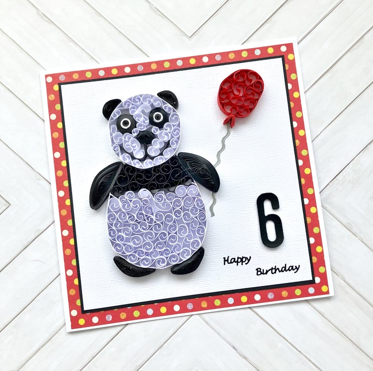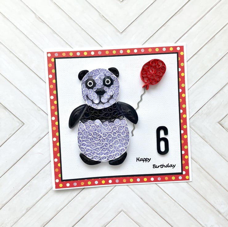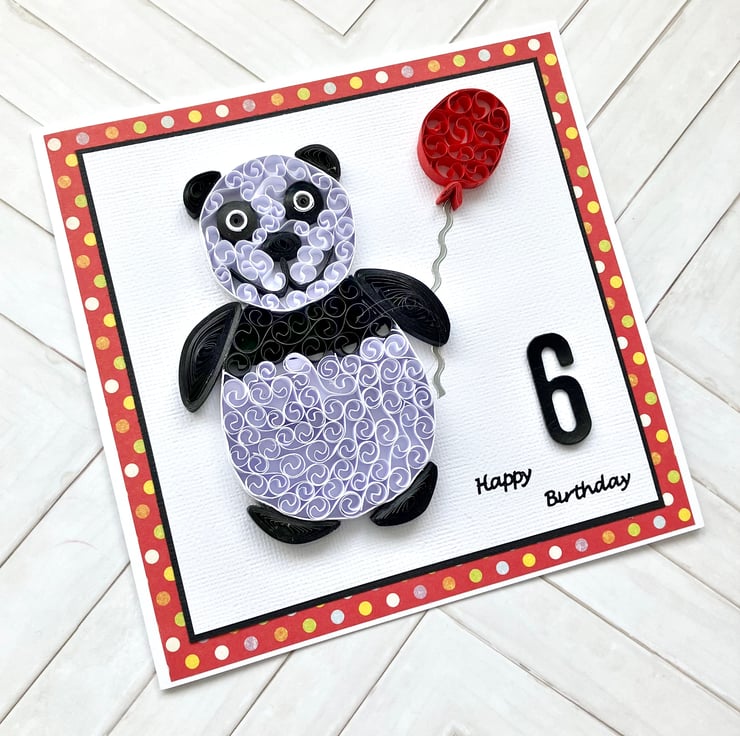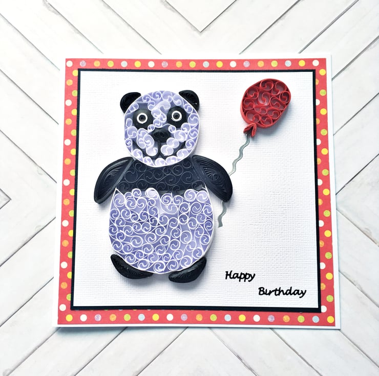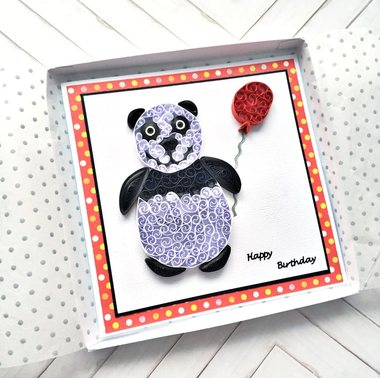 This is a quirky and unique three-dimensional birthday card featuring a beautifully quilled panda carrying a balloon.