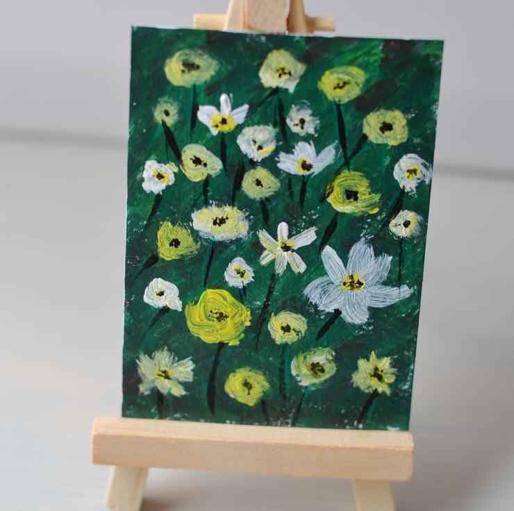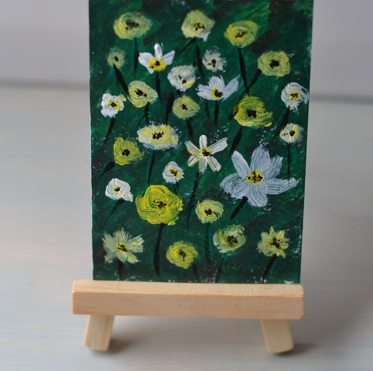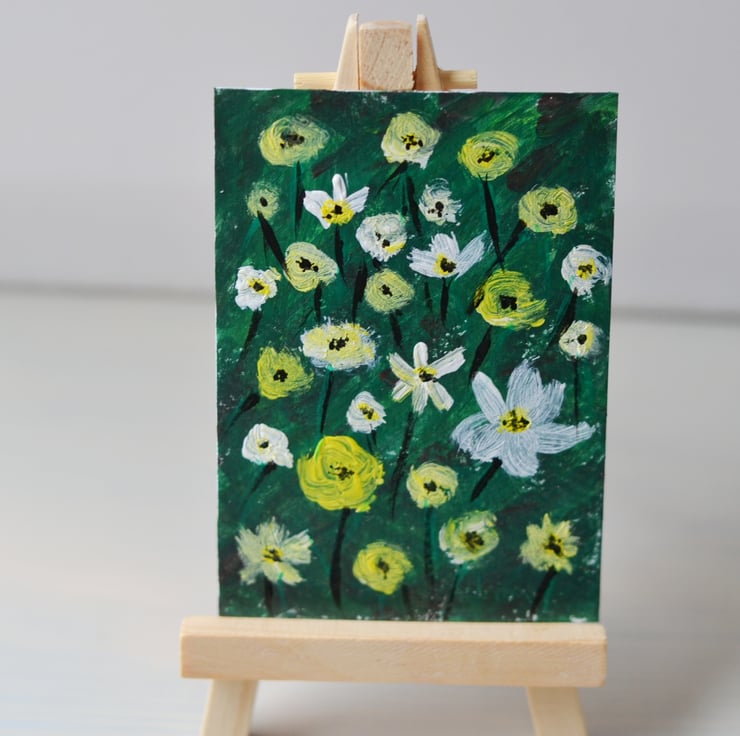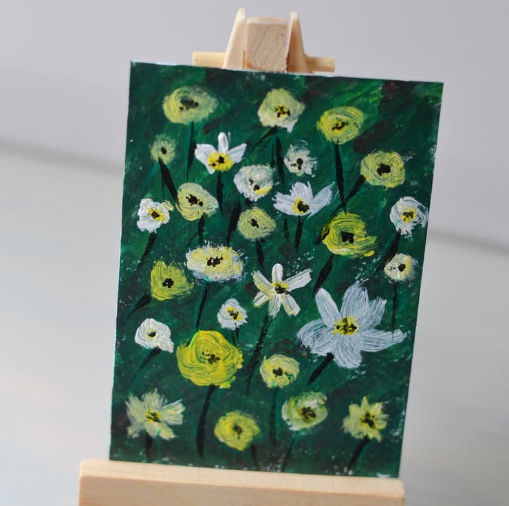 Aceo acrylic painting . Ranuculus flowers and daisies bursting forth. Painted on quality watercolour paper. . Painted using quality acrylic paints. Size is 3.5" x 2.5". I can put it into an ivory mount for £1.50. - Doesn't take as much wall space as a more traditional painting. Keep out of direct sunlight due to fading and away from water.