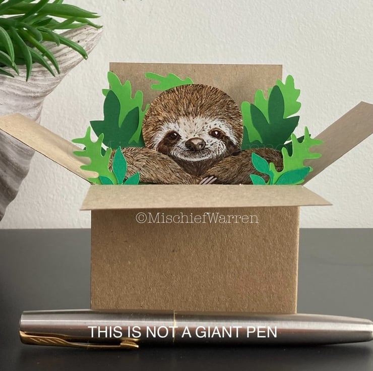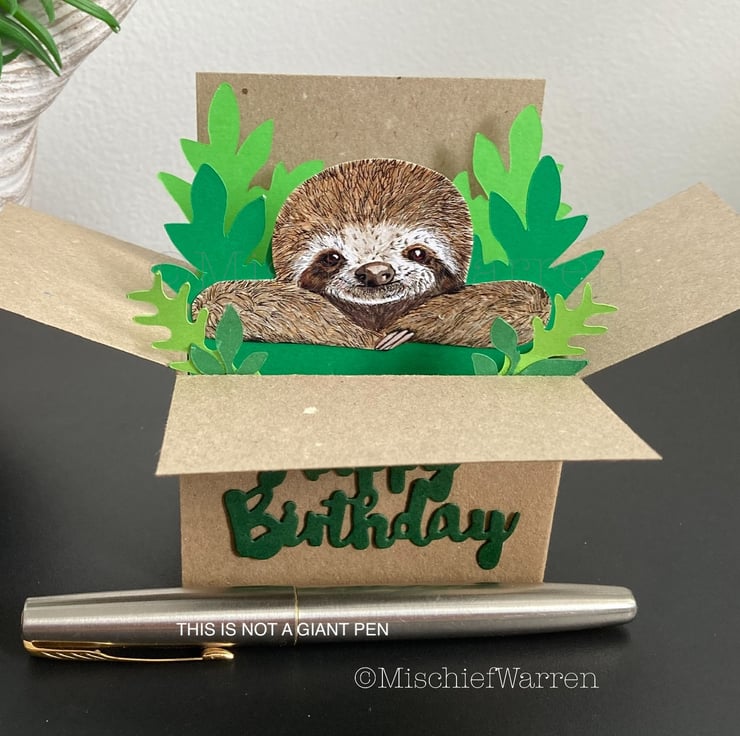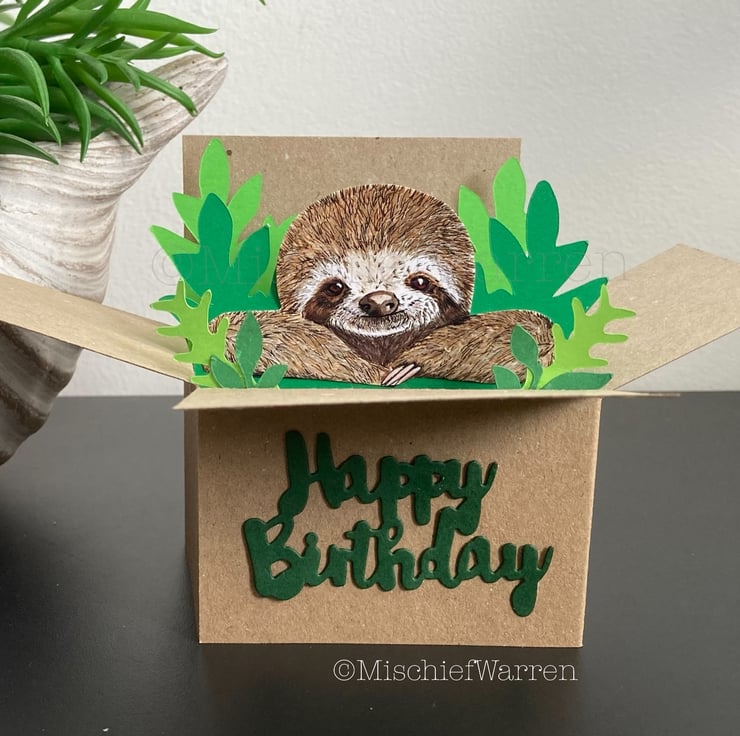 Sloth in a box card. A cute sloth peeking out from the greenery in this little box card, perfect for any sloth lover. This sloth card can be blank, personalised (for any occasion) with a printed tag on the front OR I can add Happy Birthday cut from card.