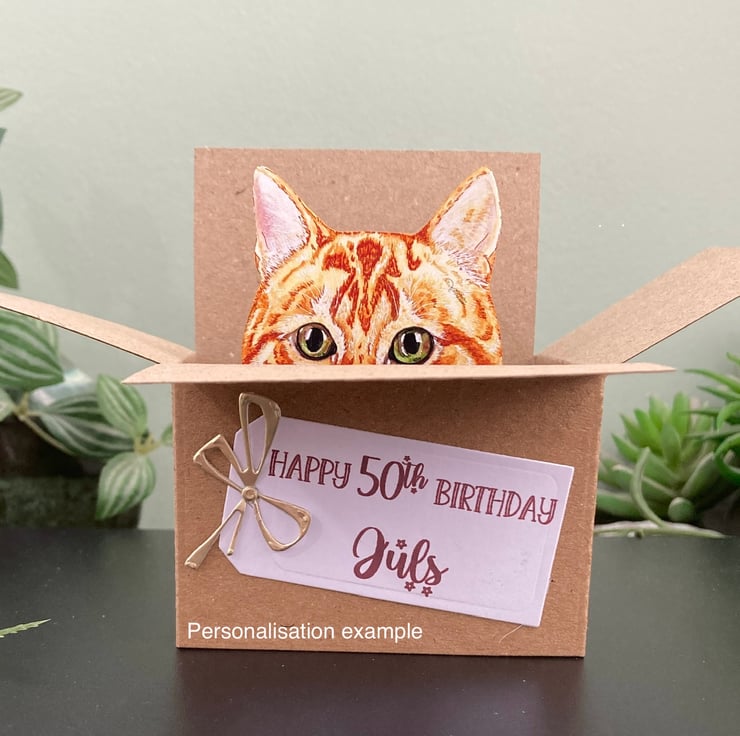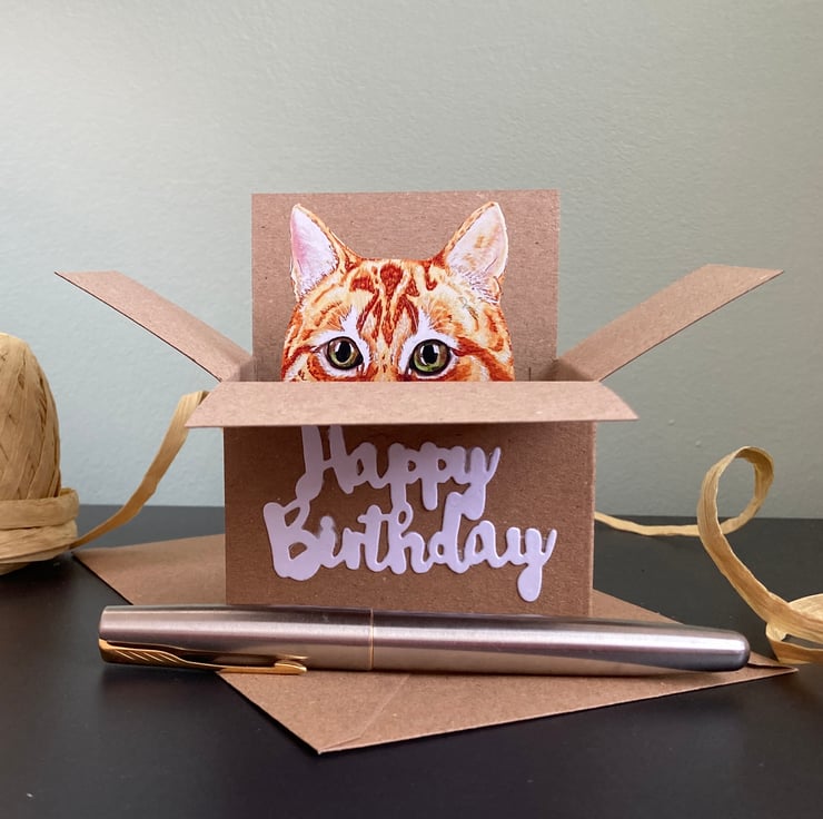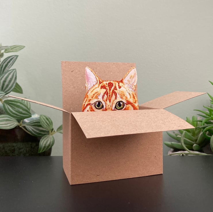 The recycled kraft card “box” folds open to reveal a peeking ginger cat. The purrfect gift card for cat lovers. Designed and handmade entirely by me (including my ginger cat painting) here in Devon.