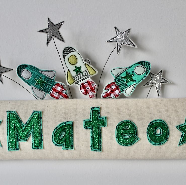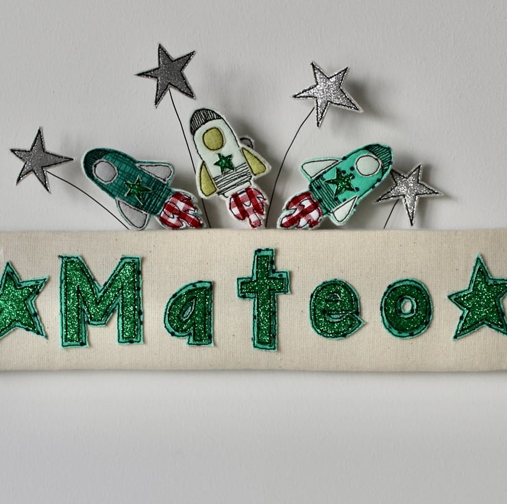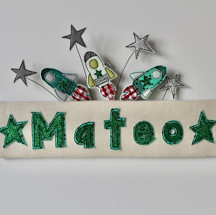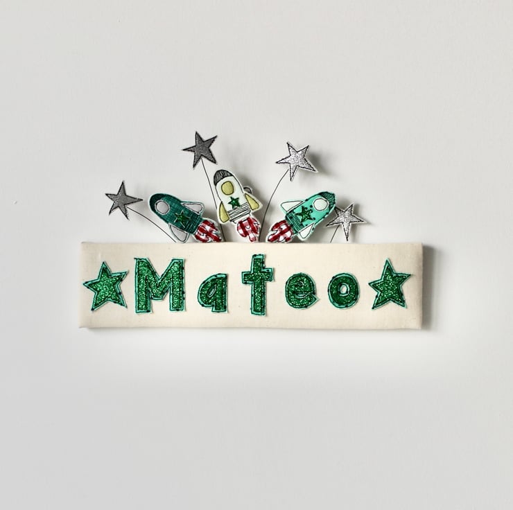 A padded cream coloured door plaque, proudly displays the name ' Mateo' in green glitter cloth; with three space ships and four silver glitter stars.