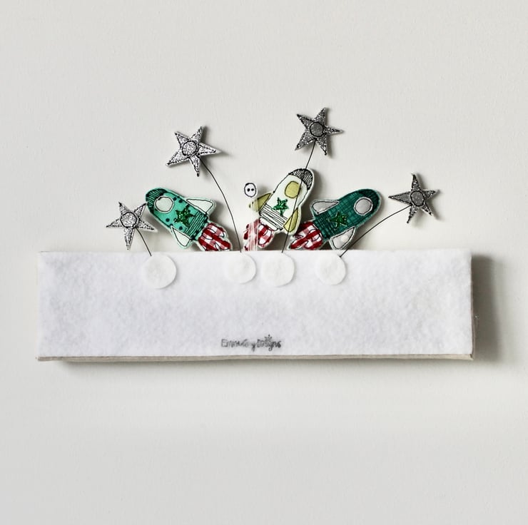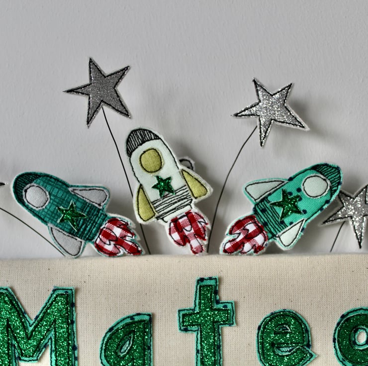 The letters, stars and space ships are sewn using multiple layers of cloth, free hand machine embroidery and cut out by hand using very sharp scissors.