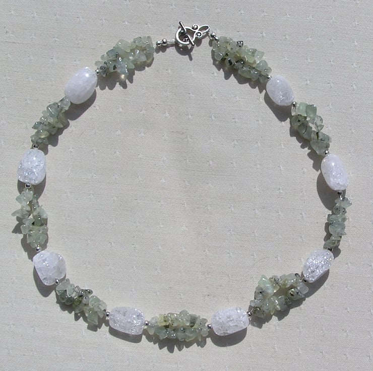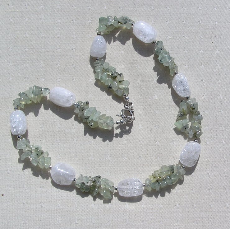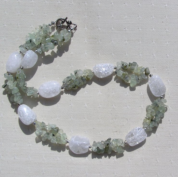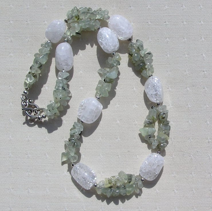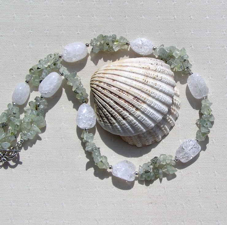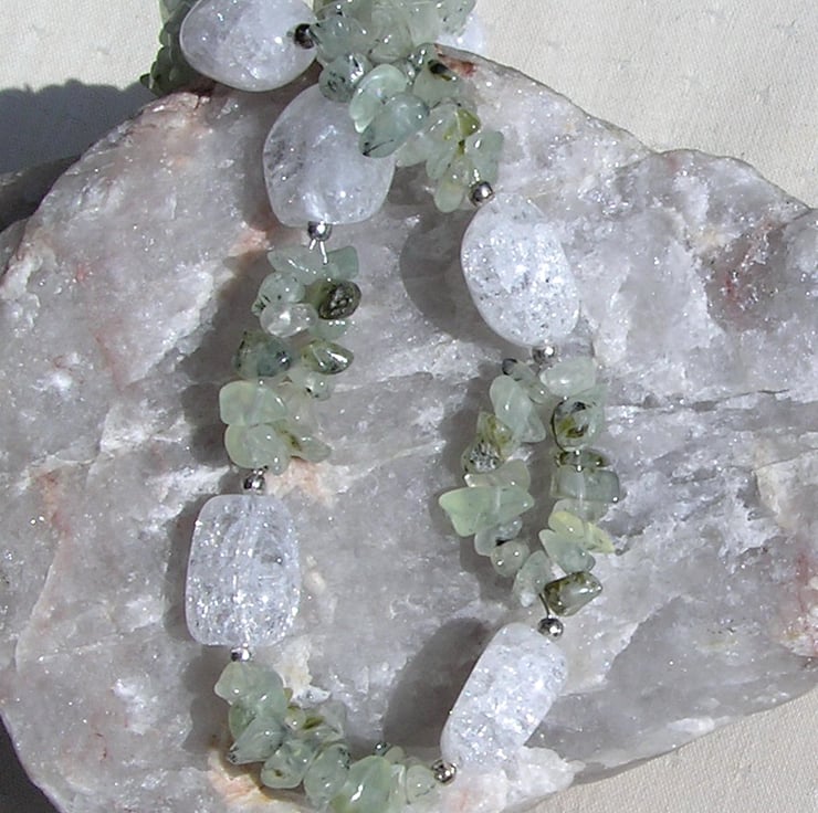 This Stunning Necklace is made from Chunky Crackled Clear Quartz Nuggets separated by double-stranded Green Prehnite Gem Chips, along with tiny Silver spacers - a Beautiful glistening combination that will look stunning either worn casually or with something more Elegant for a Special Evening out