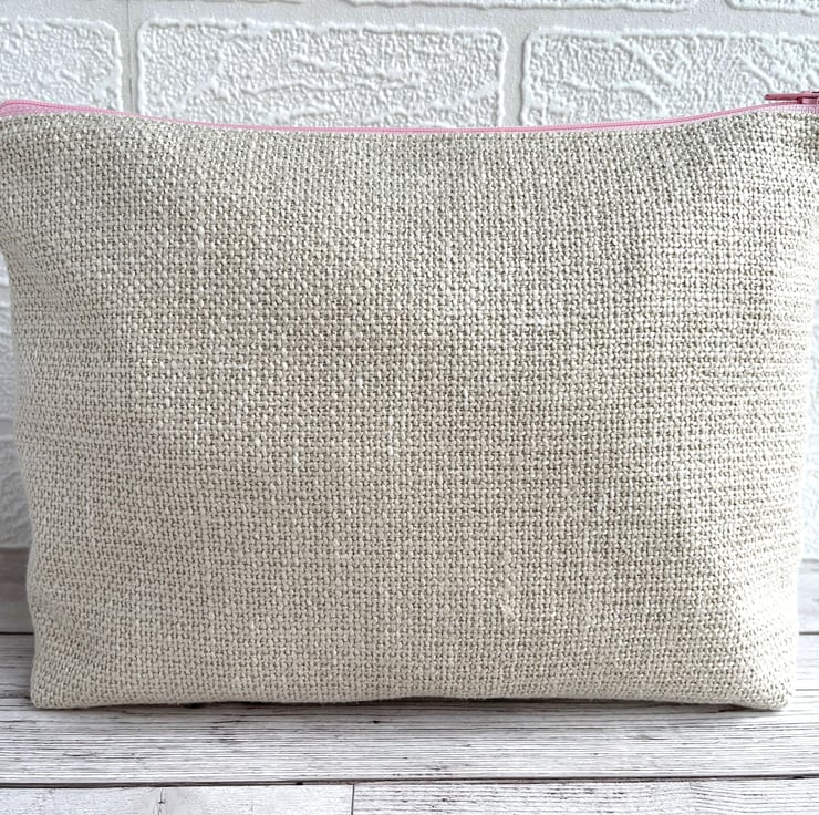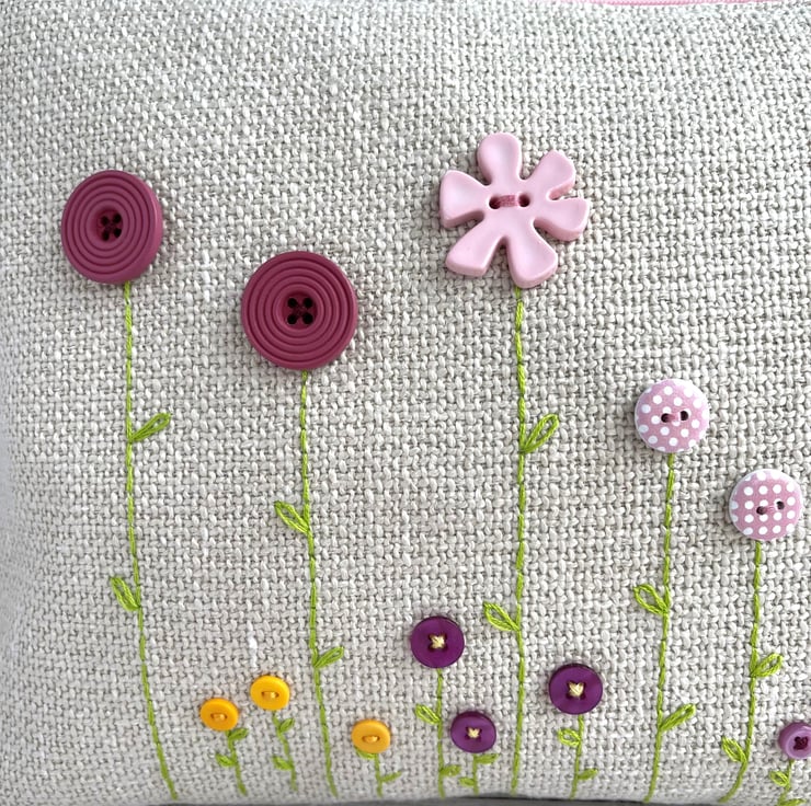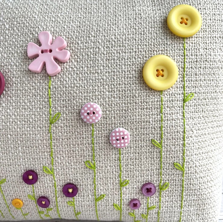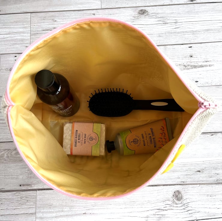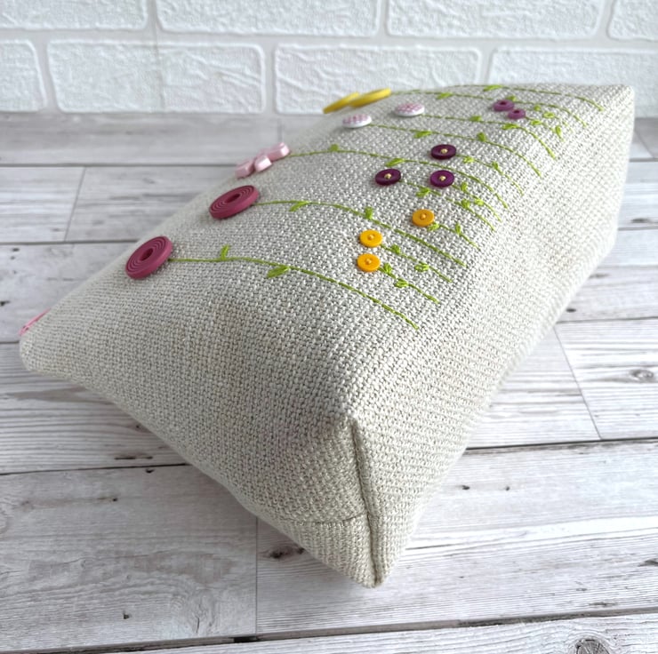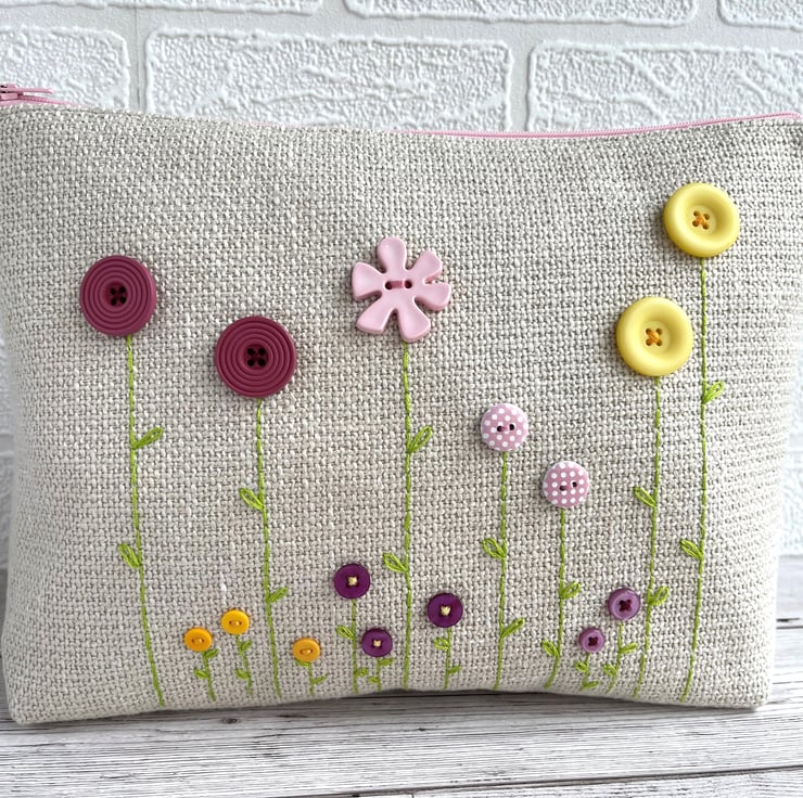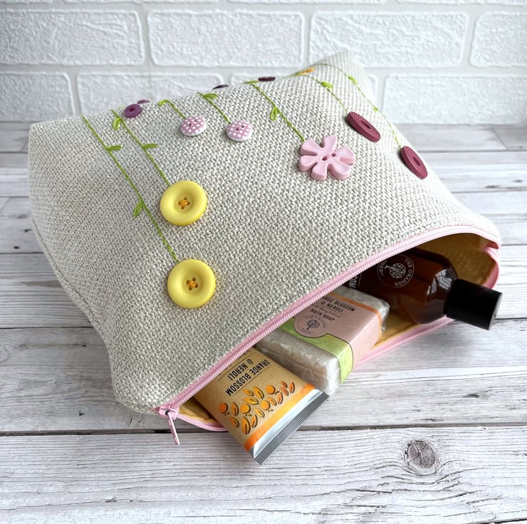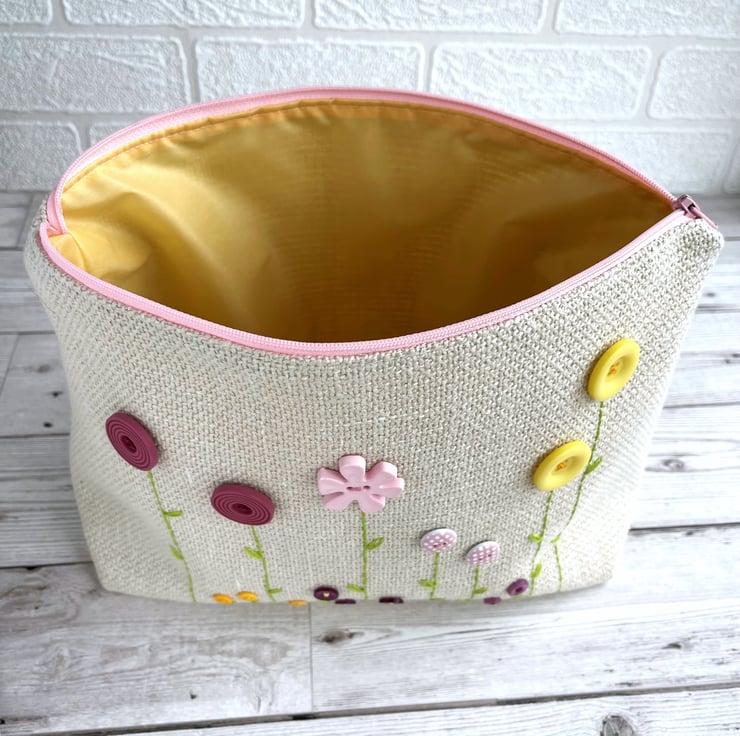 Summer garden toiletry bag with button flowers. This luxurious toiletry bag is made from rustic cream upholstery fabric and has a row of button flowers. I've decorated the wash bag with fifteen flowers, each with a button as a flowerhead. The buttons are of varying size in pretty shades of pink, purple and yellow, some with white polka dots. The buttons include round and flower-shaped designs with a variety of styles, and are a mixture of wood and plastic. The leaves and stems of the flowers have been lovingly hand-embroidered with zesty green stranded cotton thread. The bag fastens with a matching pale pink zip and is lined with golden yellow water-resistant fabric.