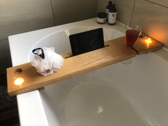 Your bath caddy also features a wine glass holder, or plenty of room to stand a drinks glass or coffee cup, a round grove with drainage holes for your sponge or flannel, and space for 4 tea light candles for you to lay back and relax with.