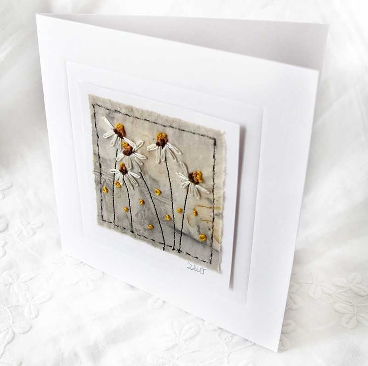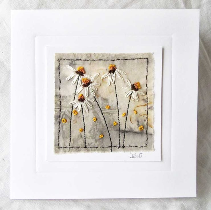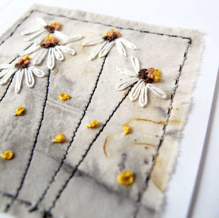 A pretty card that has been embroidered by hand with little daisy style flowers onto a background of eco printed fabric. The fabric has been mounted onto a card base and is surrounded by an embossed frame. The card has been left blank for your own message.