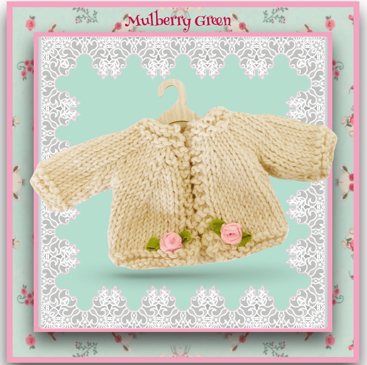 A pretty cream cotton cardigan, decorated with little pink rosebuds, to fit the Mulberry Green characters. It looks lovely with the other things in the ‘Bunnies and Bonnets’ collection in my shop.