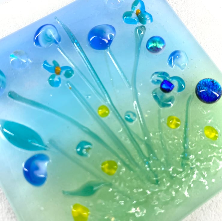A pretty mix of blue & turquoise flowers with sparkly dichroic glass which catches the light beautifully.
