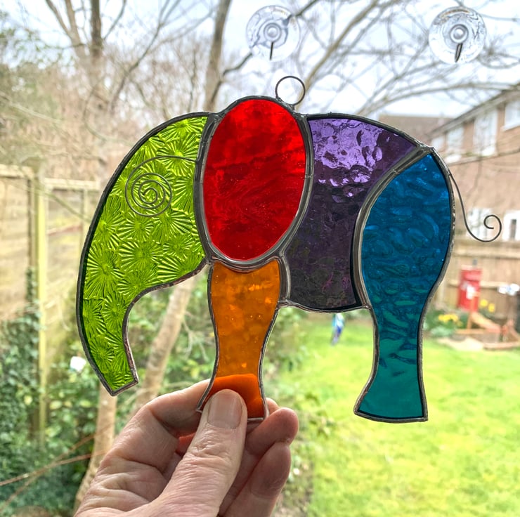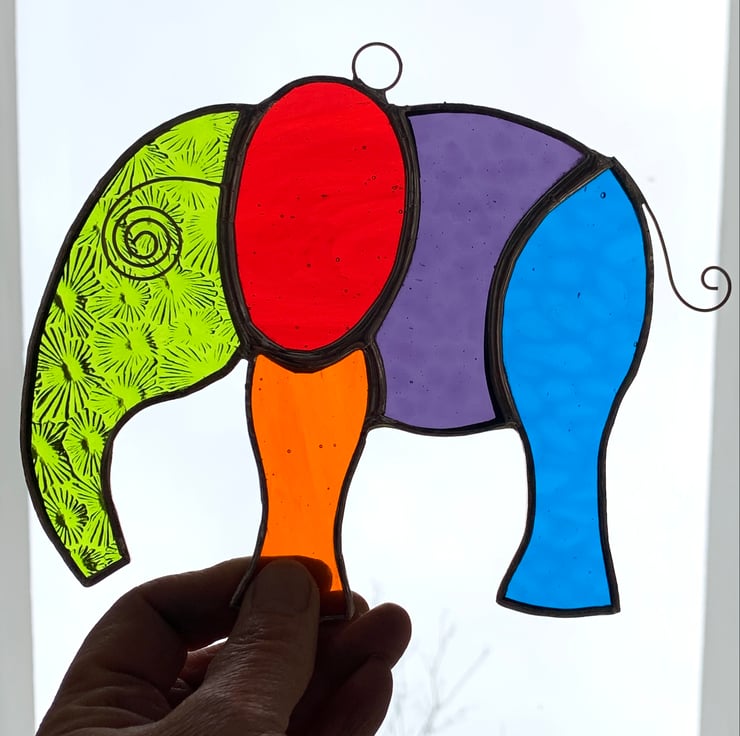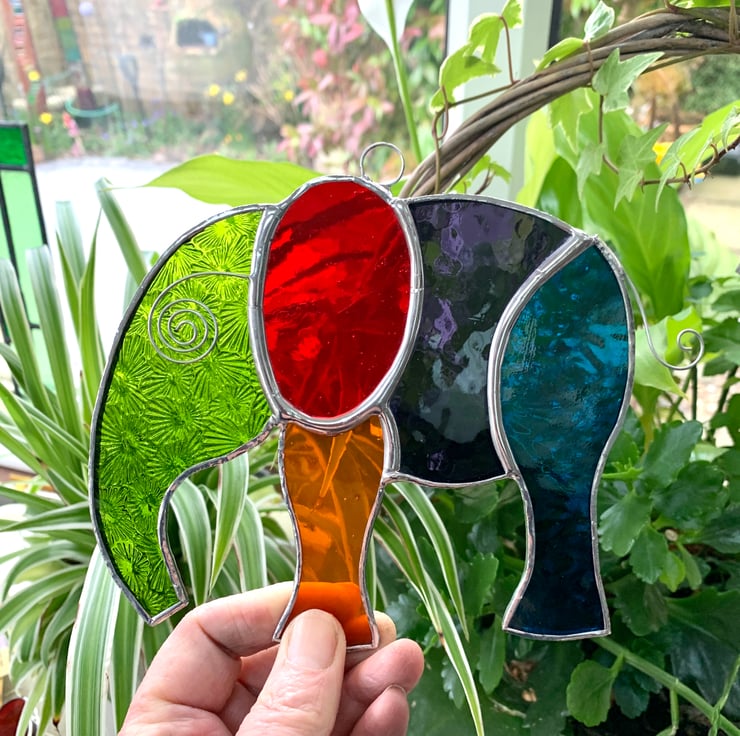 This elephants measure 14.5 cms x 13 cms and has been made from a selection of 5 different types of vibrantly coloured stained glass. The glass also has some really interesting textures.