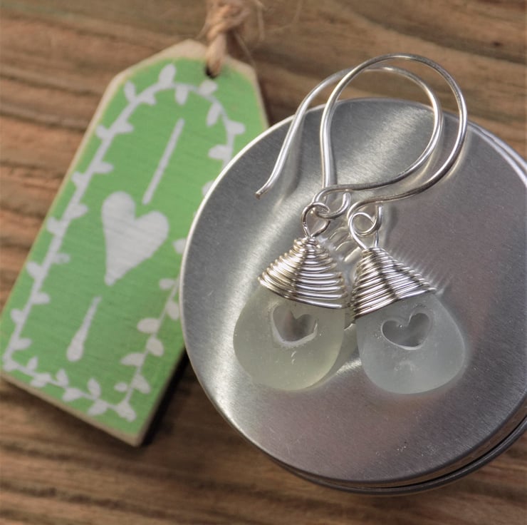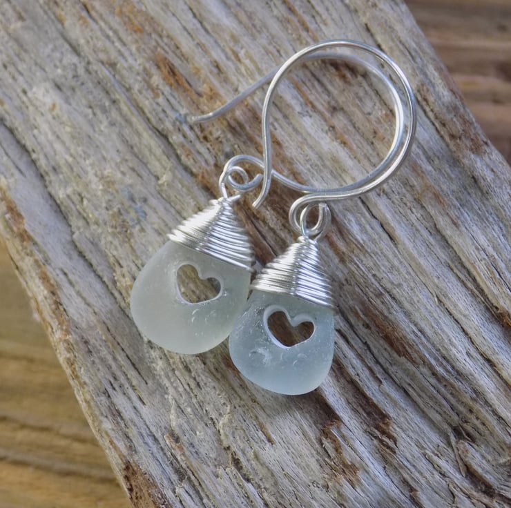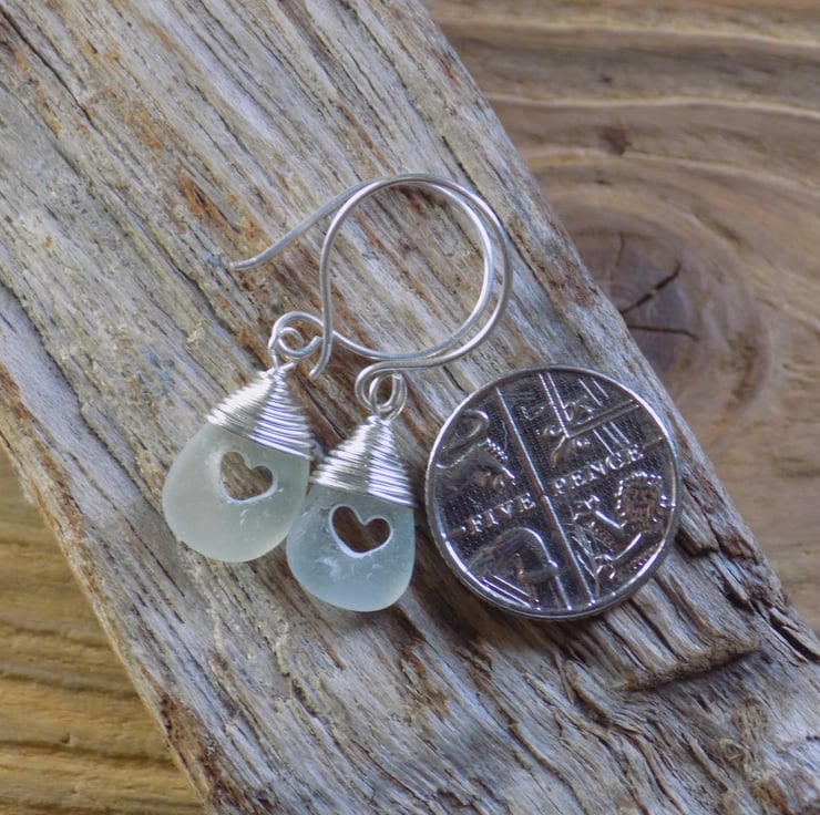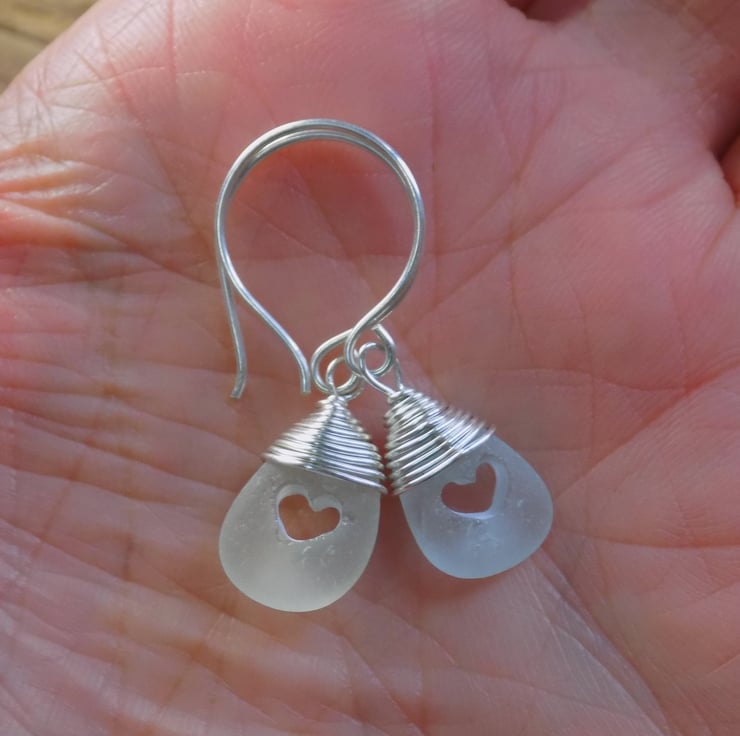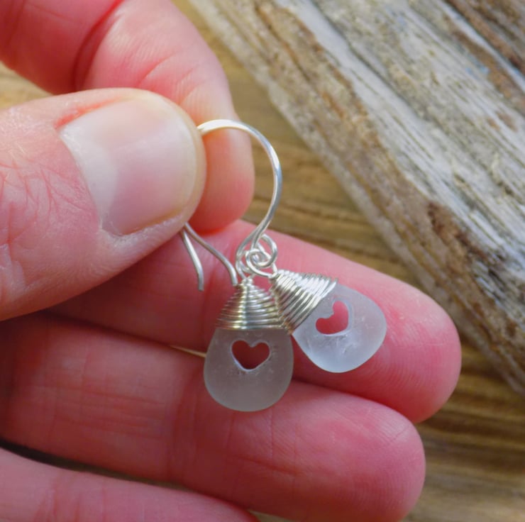 Each small piece of sea glass has carefully been drilled out to form a heart in the centre. The tops have been wrapped with silver plated non-tarnish wire and attached to 0.7 mm hand made sterling silver French wires. An unusual and dinky pair of earrings !