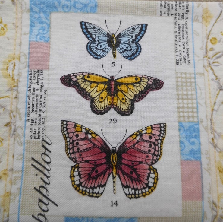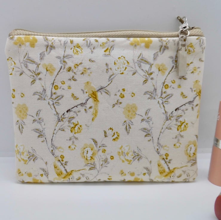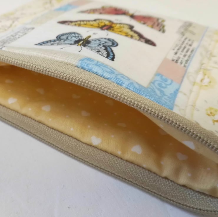 I have made this purse using a beautiful quilting cotton by Laura Ashley called Summer Palace in soft yellow. On the front is a printed panel which features three pretty butterflies. The inside is lined with a yellow/cream cotton with small printed white hearts.