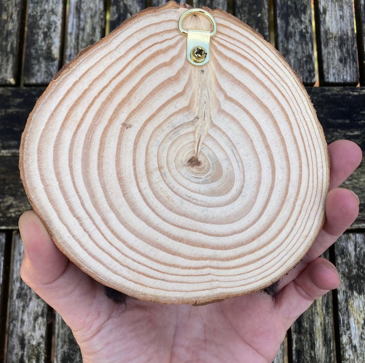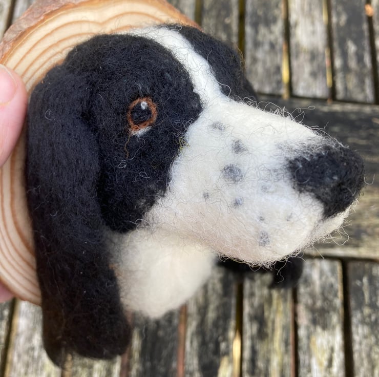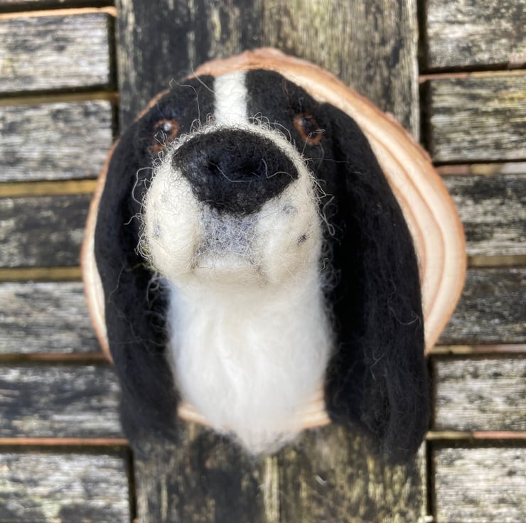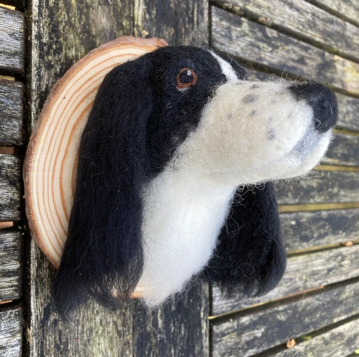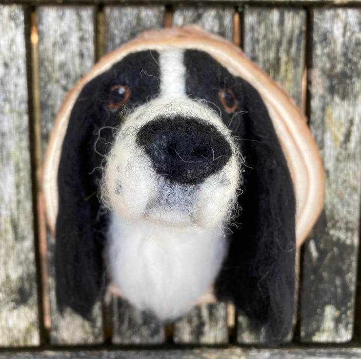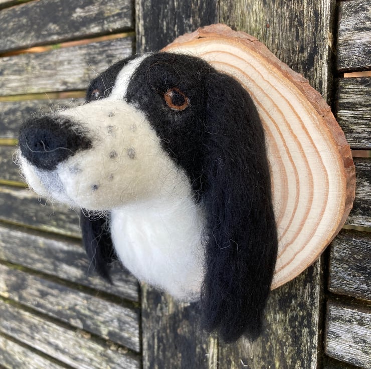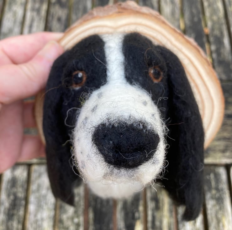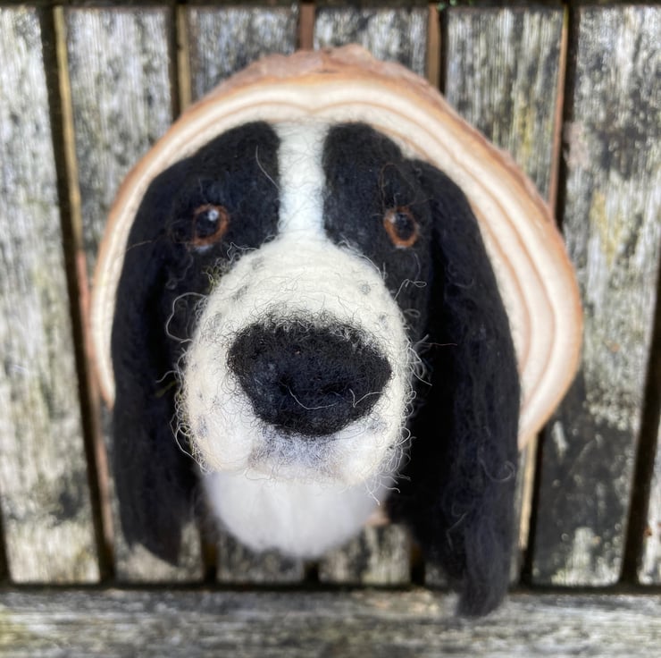 An adorable springer spaniel, head sculpture which has been needle felted from woollen fibres using a barbed felting needle to sculpt the wool into shape. After sculpting markings have been added and ears formed using long merino wool fibres. The final sculpture has then been mounted onto a wooden slice and a small brass hanging hook added.