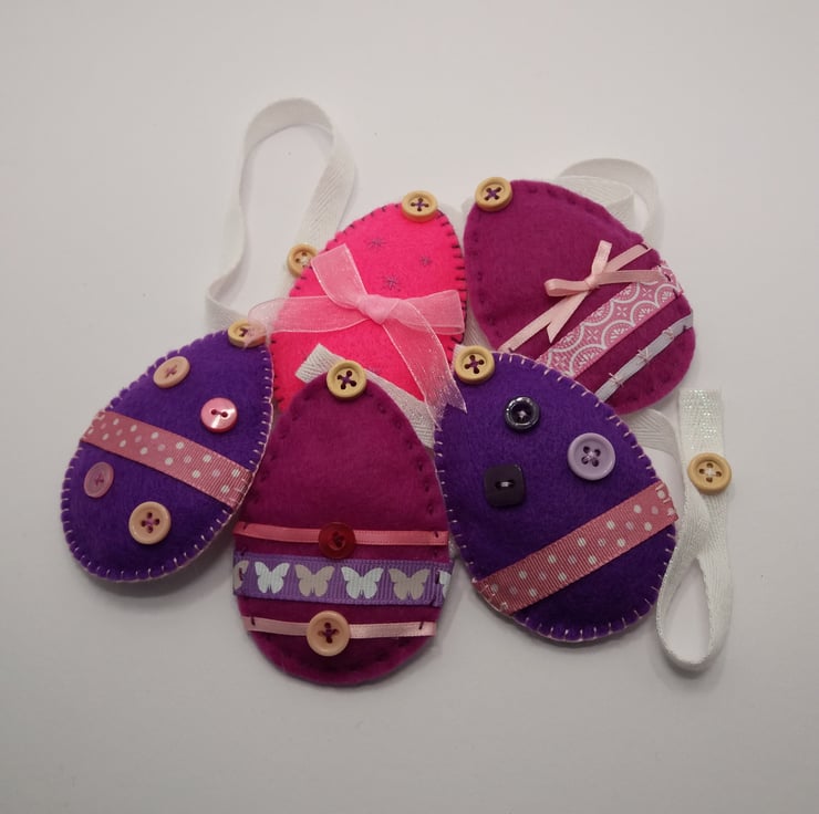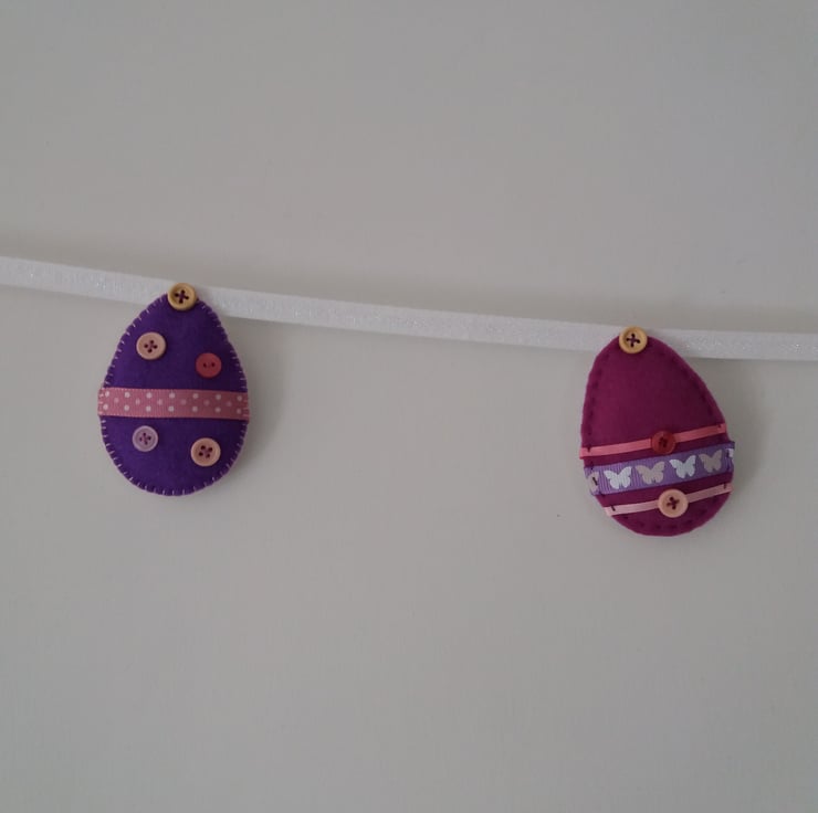 Hand-sewn, felt egg bunting. Five pink and purple felt eggs (approx. 7.5 cm x 5.5 cm), decorated with a variety of ribbons, buttons and embroidery. Attached to 1 cm wide white, sparkly webbing. Approx. 105 cm long.