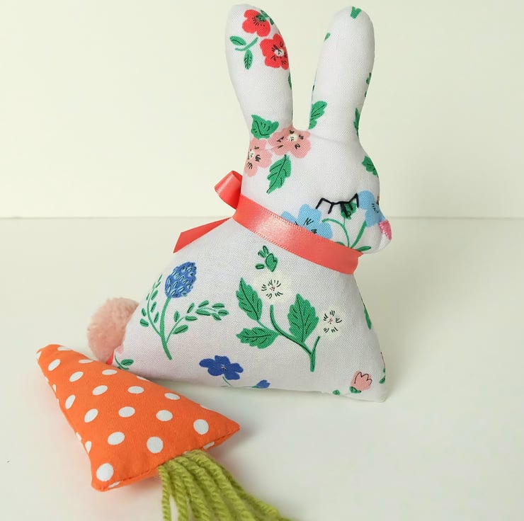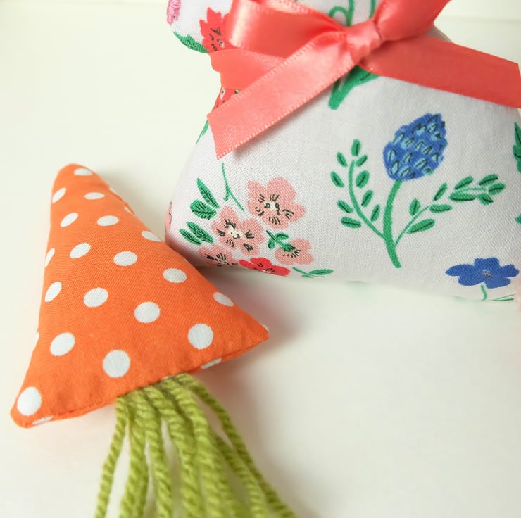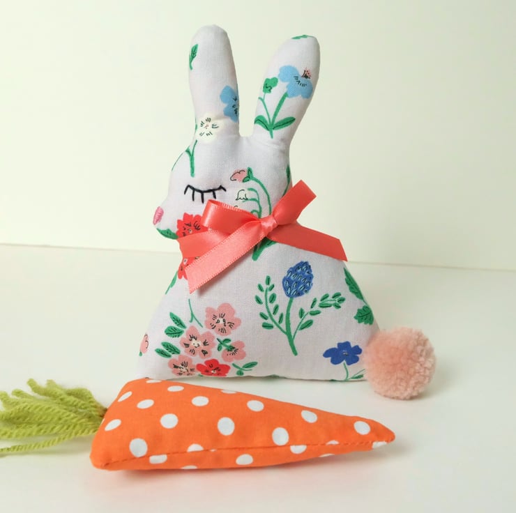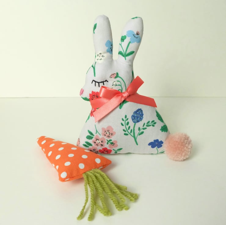 The lavender filled rabbit is made from an organic cotton fabric in grey with a wildflower print in plaster pink, blue, green, white and brick red. The lavender filled carrot is a jolly orange and white spot cotton, with green wool leafy tops. The rabbit has some toy stuffing in it too, for extra shape. I have hand sewn eyes on each side of the head using black embroidery thread and a nose in pink embroidery thread. Finished with a dusky pink pom pom tail and a pretty coral satin bow.