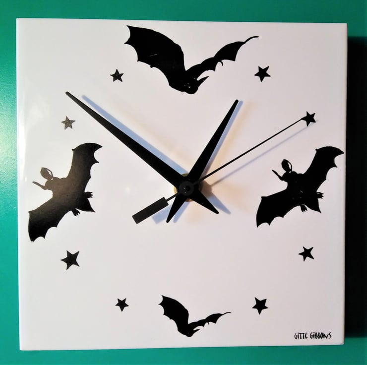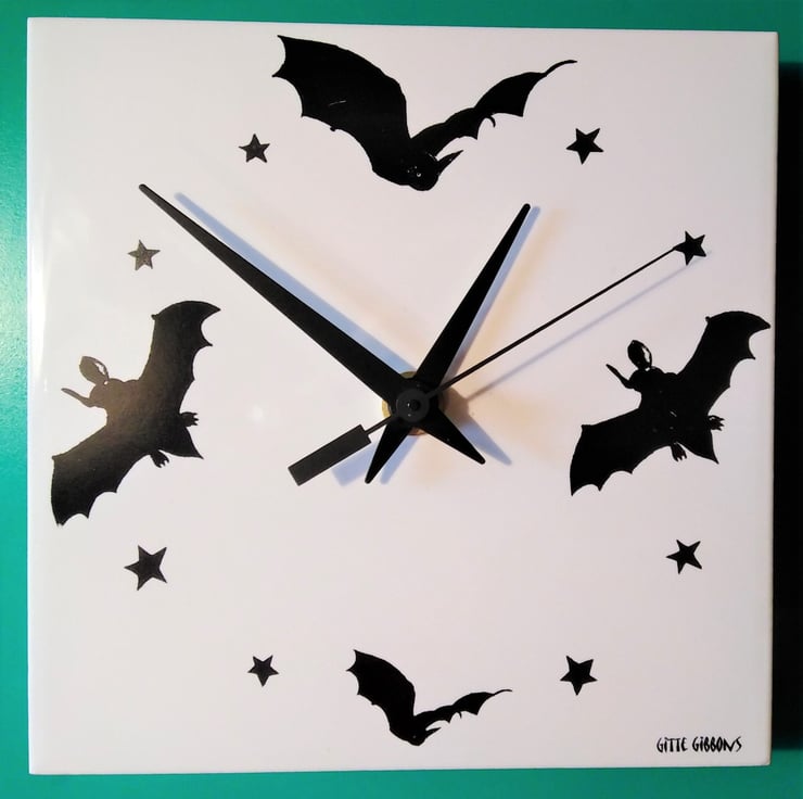 A bat wall clock suitable for any occasion for friends who like spooky but amusing things. It has been hand decorated with black bats to show the quarter hours and black stars to show the others.