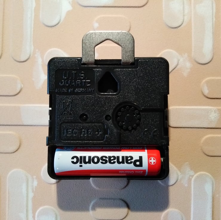 It is made from a 15 centimetre by 15 centimetre wall white glazed wall tile and powered by an AA battery powered quartz movement. It is design and made by Gitte Gibbons at Powerkraut Lounge Studio.