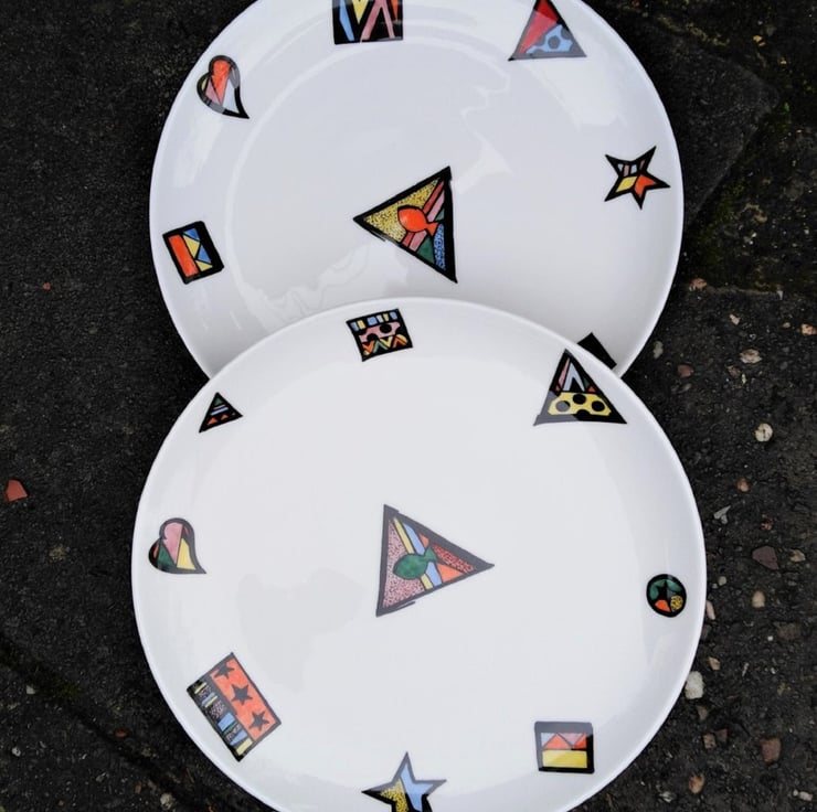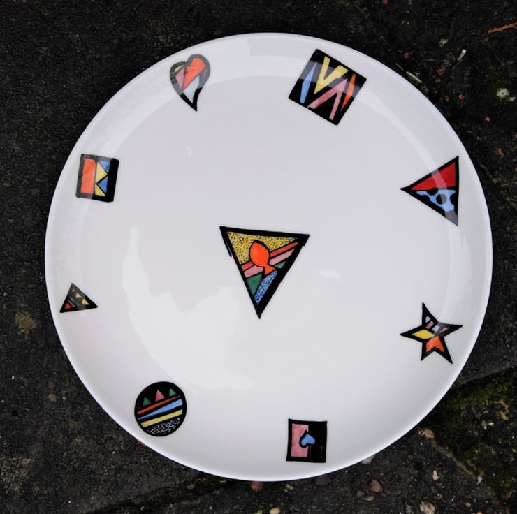 One of the many designs that I produced at my studio near Salisbury. It is called 'Sylvester' which is the German name for new years eve, named after Pope Silvester. The random shapes and bright colours represent a carnival. Most of my bowls and plates are in pairs, but I will sell them separately if you only need one.