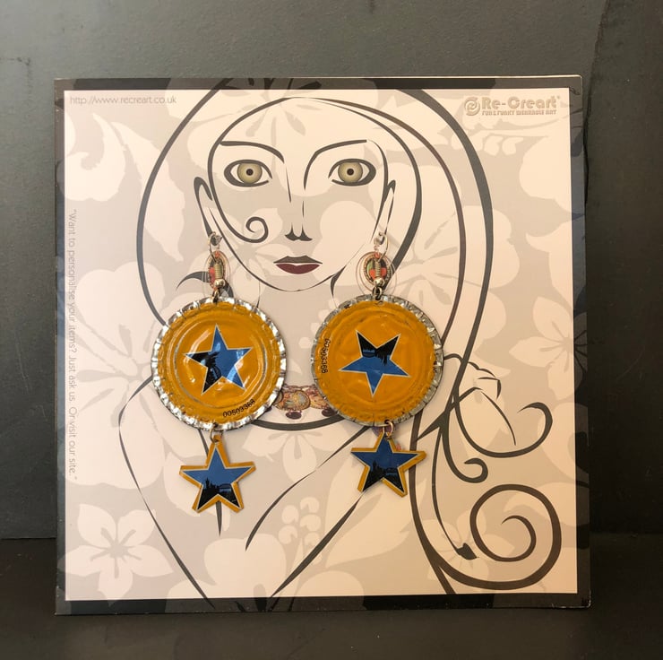 - Hand crafted from re-cycled bottle tops collected from our local pub.