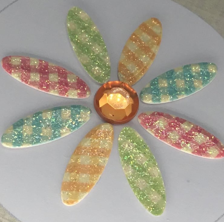 It has been printed on quality, 300gsm card, measuring approximately 15cm, or 6 inch square. The flower is made from glittered, gingham card stock. The design has been further embellished with an adhesive gem in the centre.