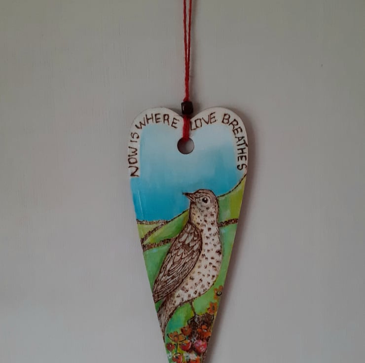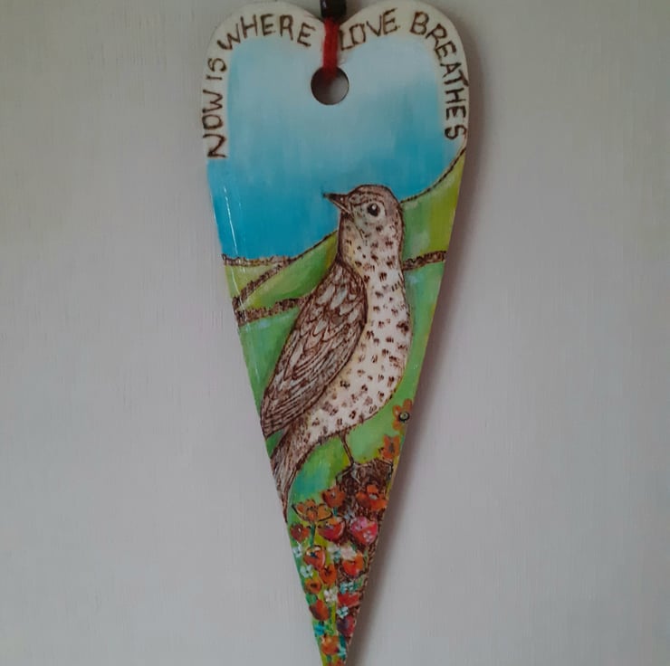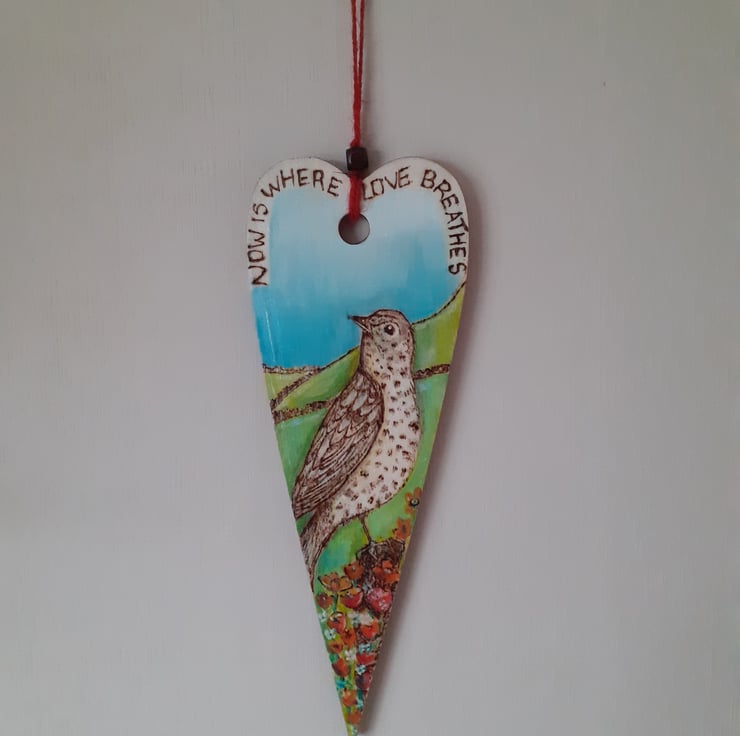 Woodburned and painted mistle thrush onto a heart plaque. Beautiful wall hanging .original design . With a motivational quote to remind you to be in the moment