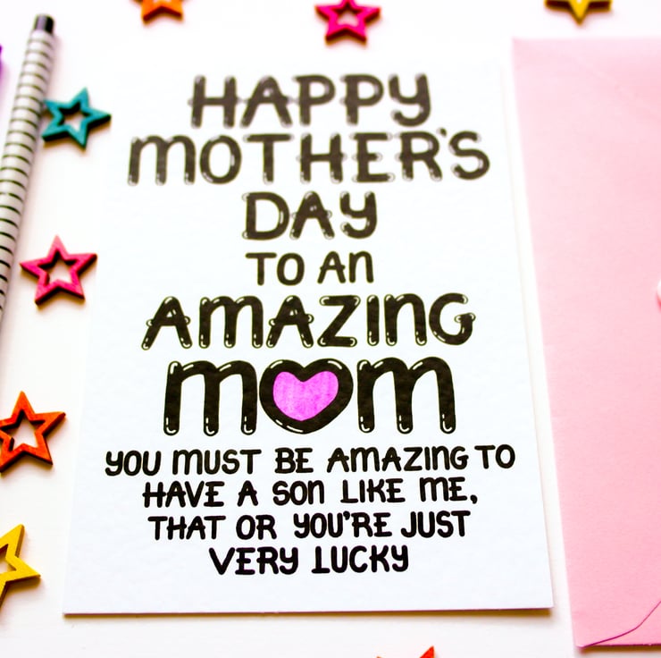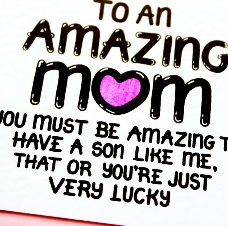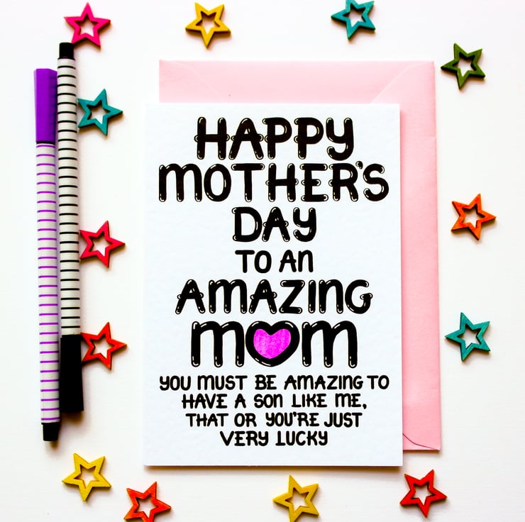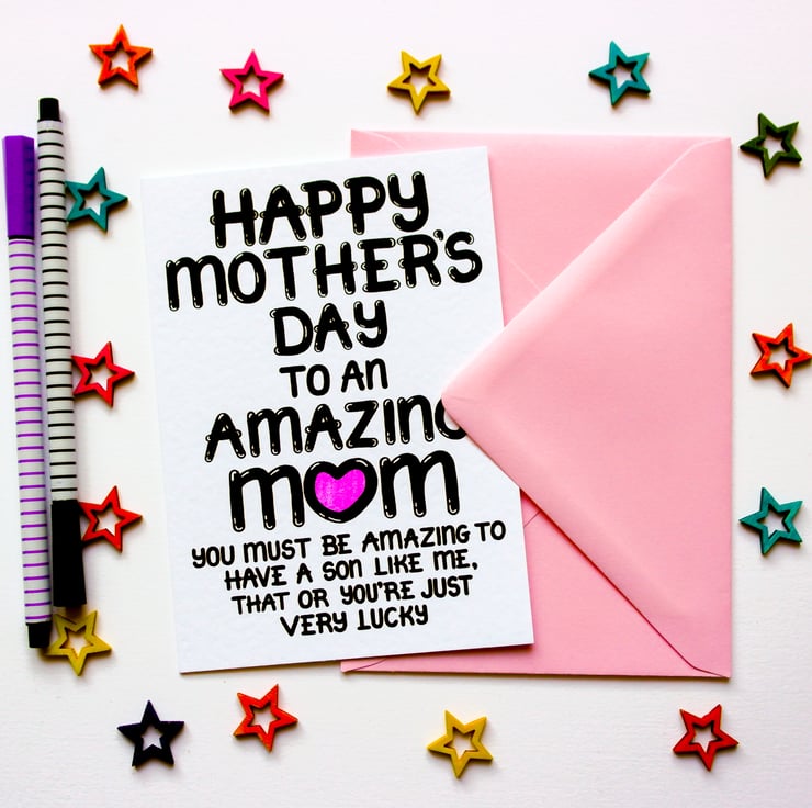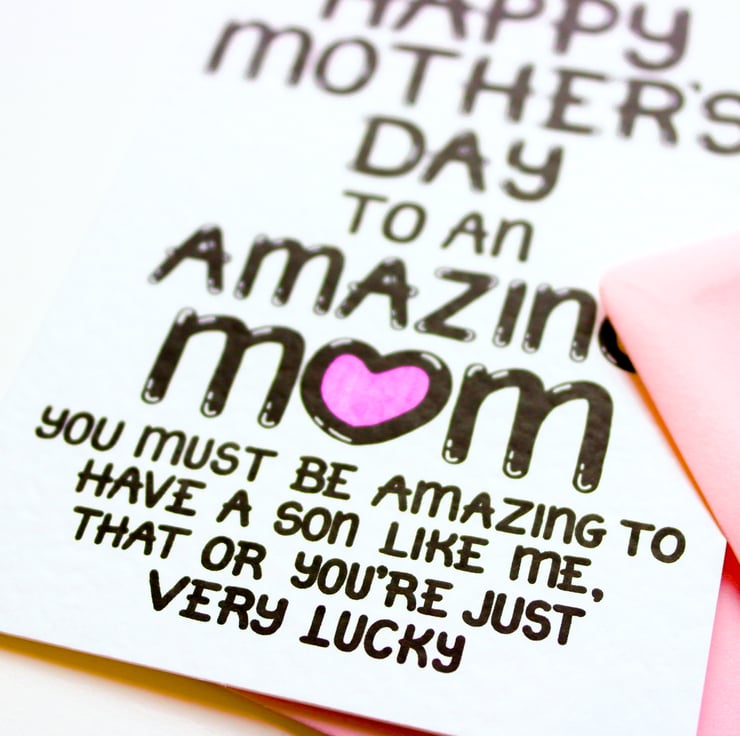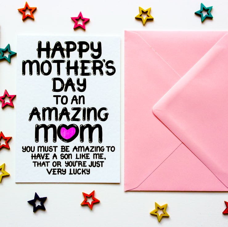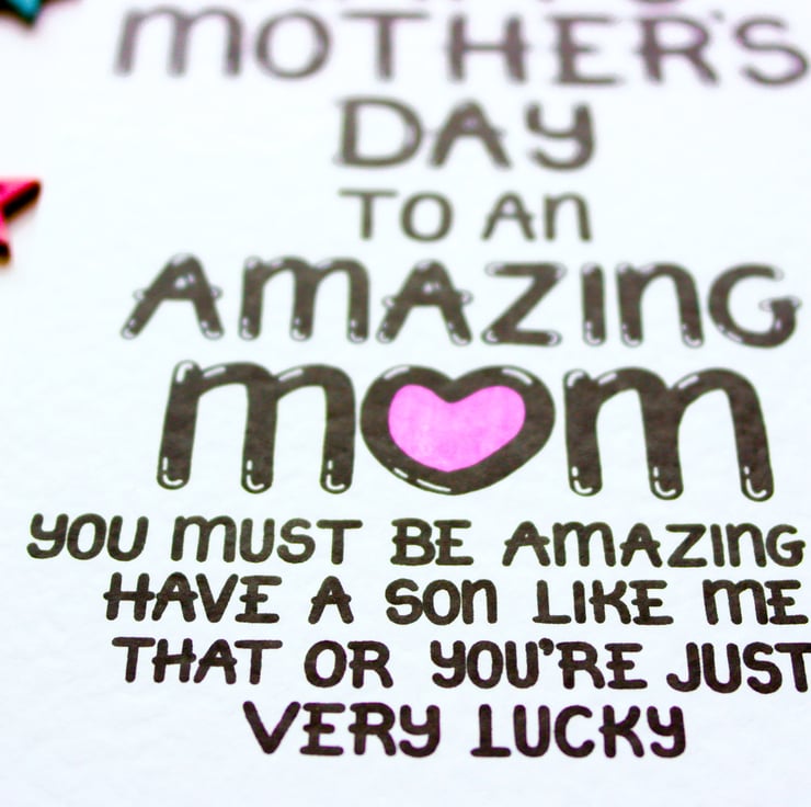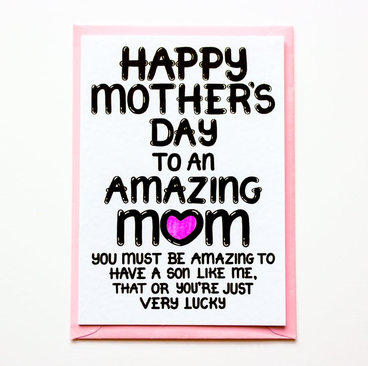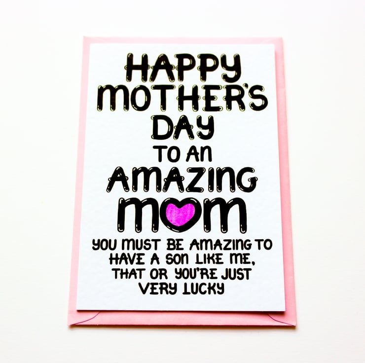Greeting on front: HAPPY MOTHER'S DAY TO AN AMAZING MUM YOU MUST BE AMAZING TO HAVE A SON LIKE ME, THAT OR YOUR JUST VERY LUCKY