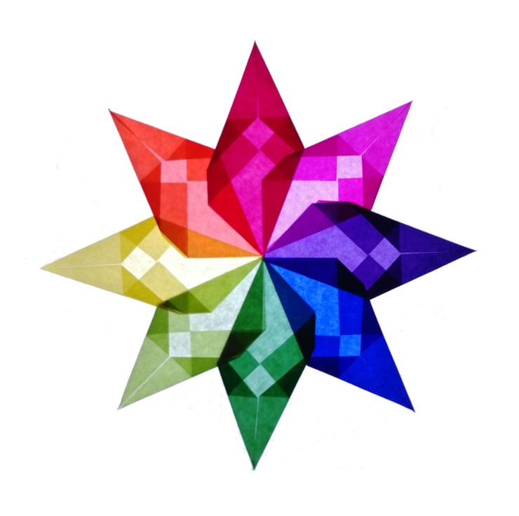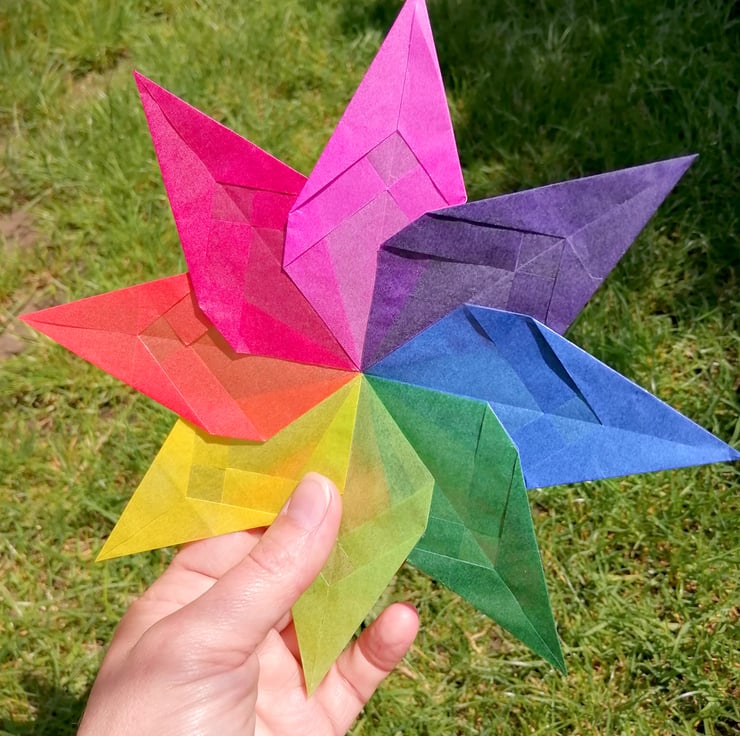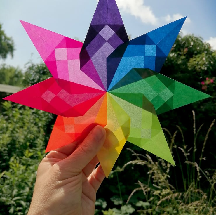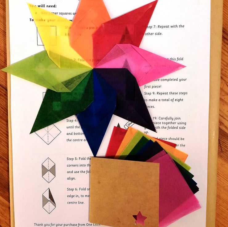 This handmade window star kit is a pinwheel design. It comes complete with a finished star; kite paper and instructions to learn to make your own beautiful window stars.
