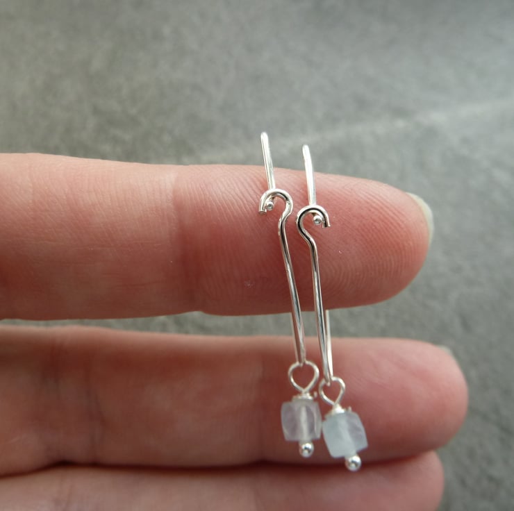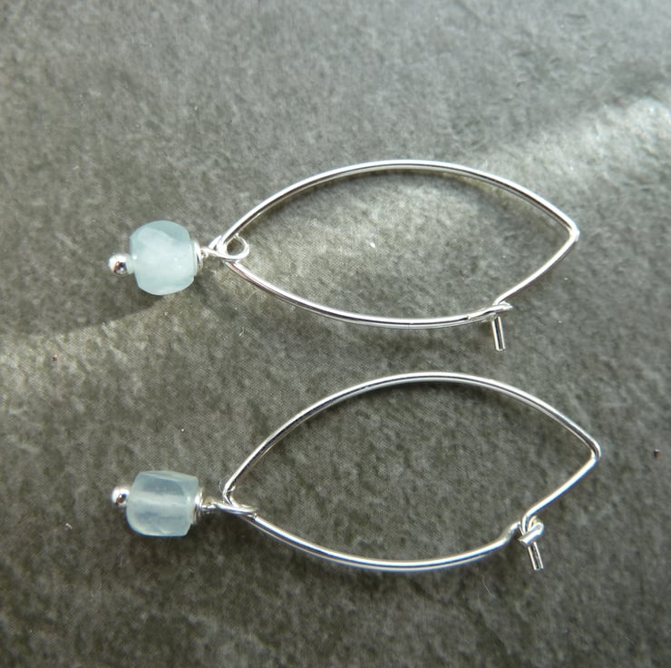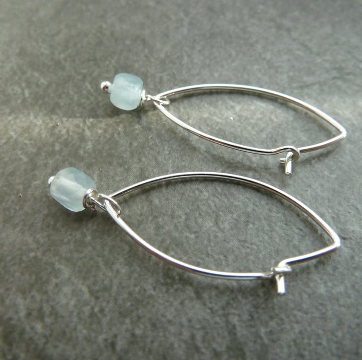A pair of sterling silver earrings which are oval shaped with a hook fastener. They feature aquamarine gemstone beads.