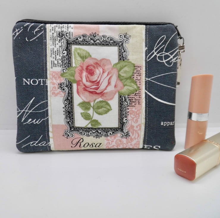 I have made this purse using a dark grey medium weight fabric, printed with vintage style text in French. On the front is a printed panel which features a beautiful pink rose. The inside is lined with a floral quilting cotton. This combination gives a romantic feel to this useful little bag.