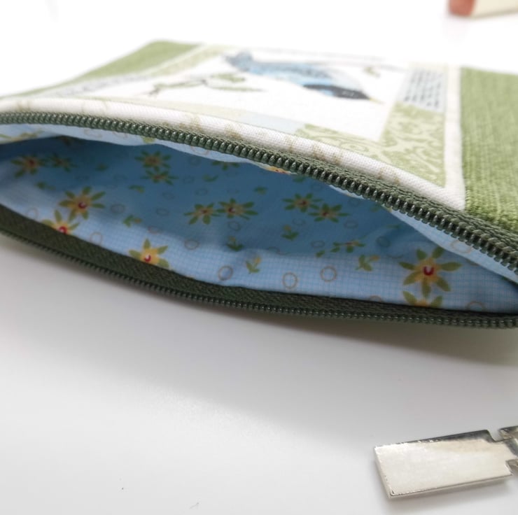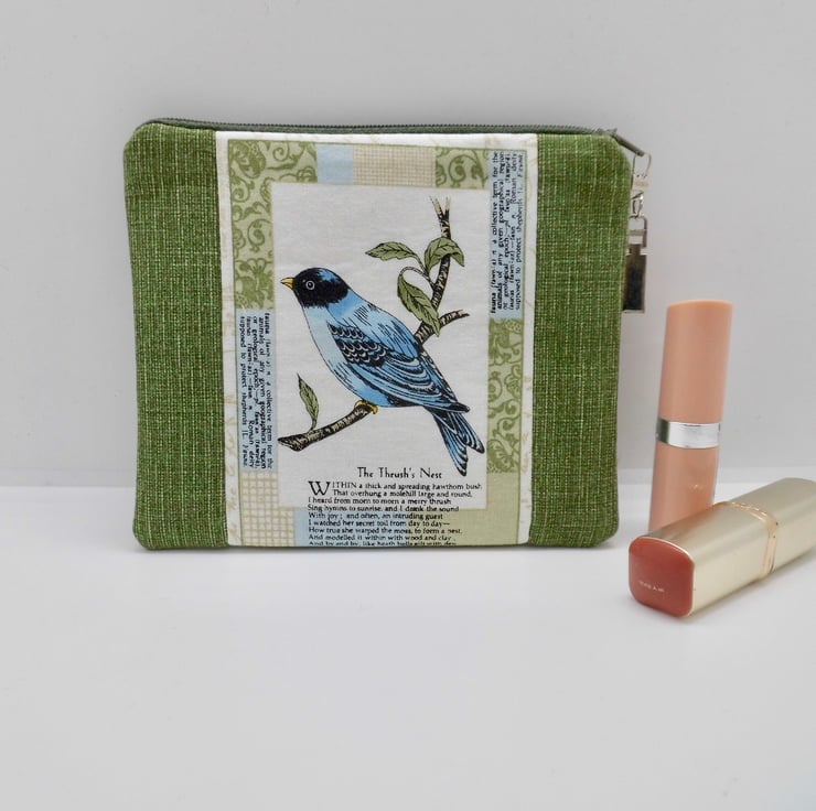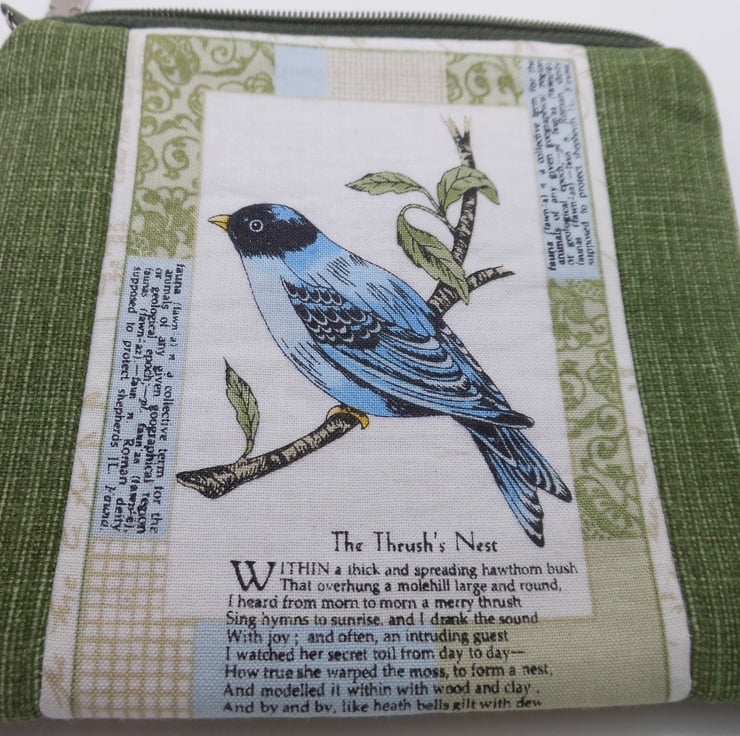 I have made this purse using a gorgeous green medium weight cotton. On the front is a printed panel which features a garden bird and words from John Clare's sonnet "The Thrush's Nest". The inside is lined with a pretty blue quilting cotton.