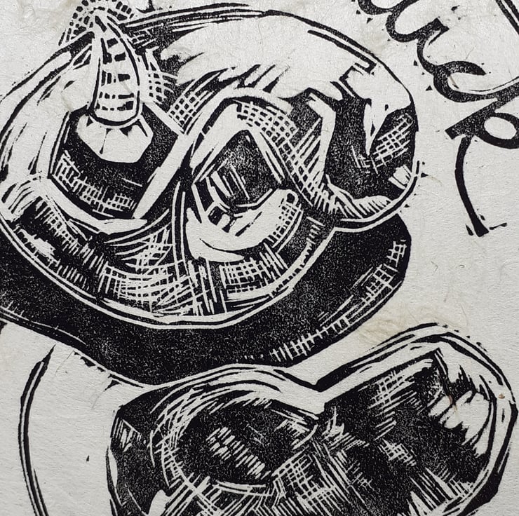 Having decided on the simple composition, I transferred my drawing onto a traditional hessian backed lino which I then hand cut and burnished in a rich black oil based ink onto a lovely piece of Nepalese handmade paper.