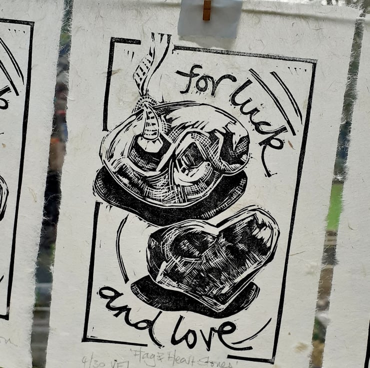 This little print was inspired by two particularly lovely stones gathered from holiday walks. It’s always so satisfying to find a heart shaped piece and I just love the idea of the hag stone as an ancient protector; legend tells how only good things can pass through the hole, whereas evil is trapped inside…